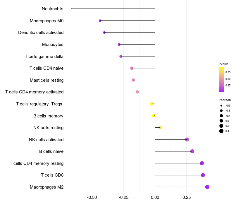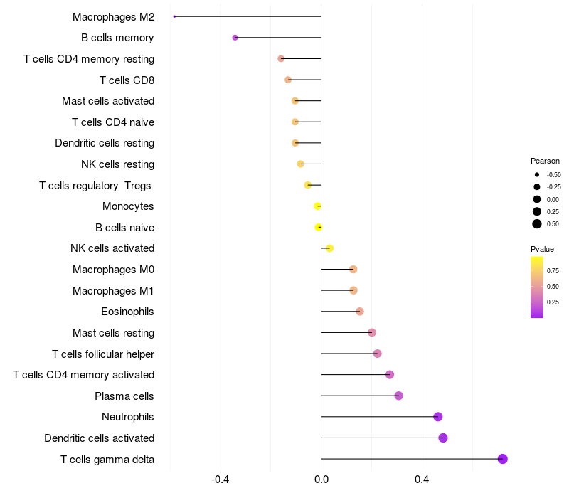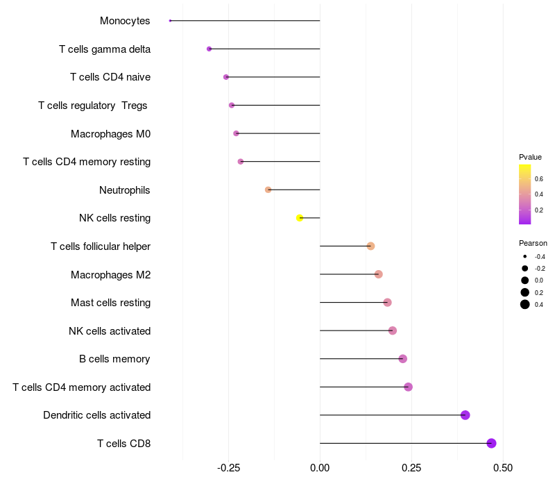 Lollipop of GTPBP8 expression and immune infiltrating cell level correlation result in HTLV1+ samples