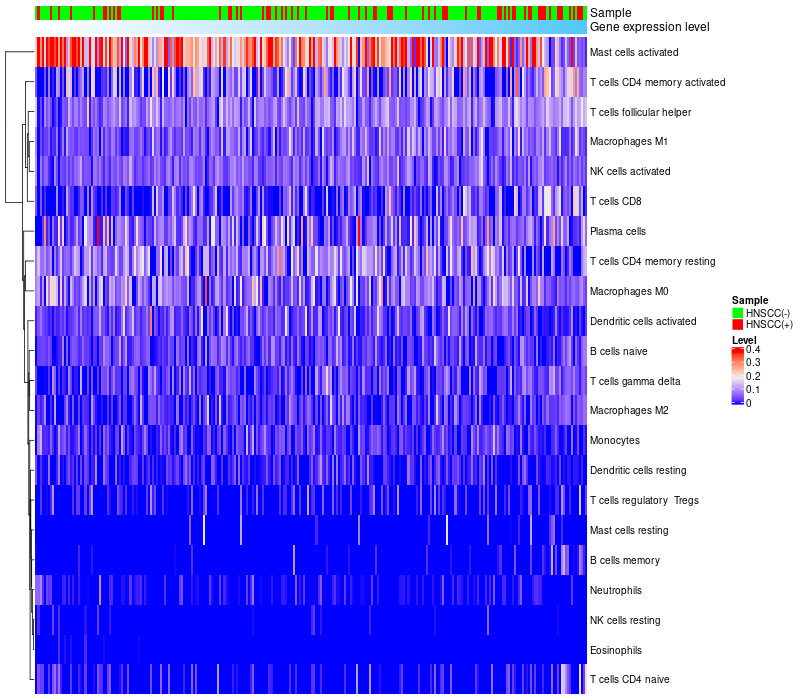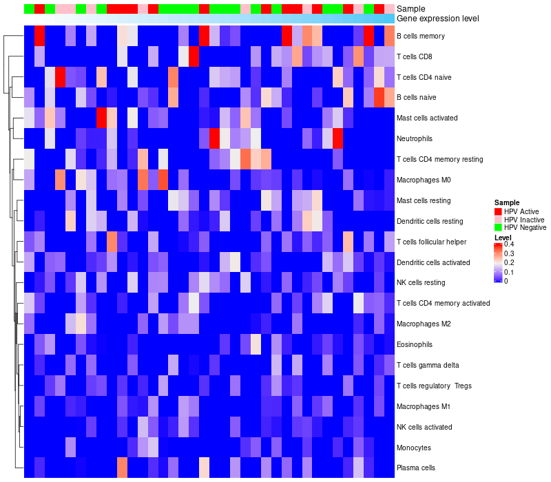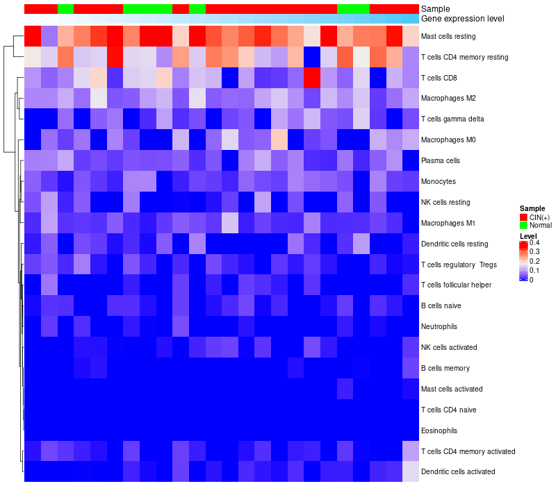 • Left: Heatmap of target gene expression and the level of various types of immune cells (cell type fractions) in all samples based on CIBERSORT method.