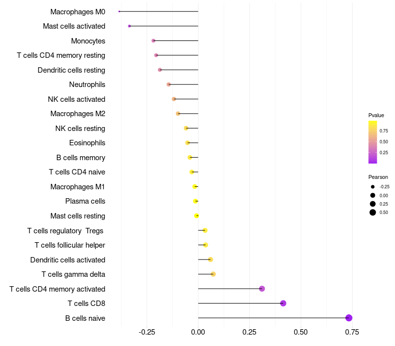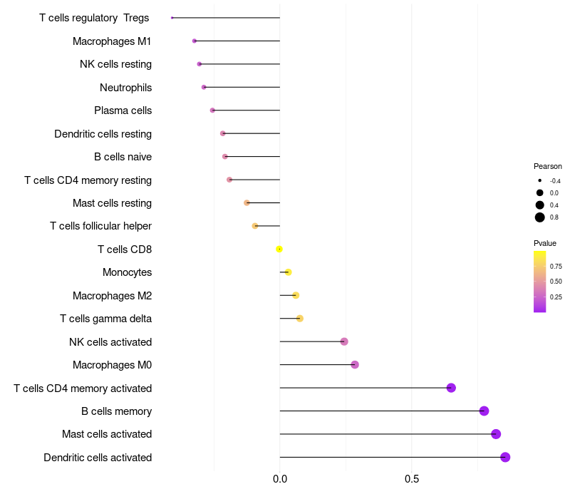 HeatMap of cell type fractions in all samples Lollipop of GTSCR1 expression and immune infiltrating cell level correlation result in HPV+ samples
