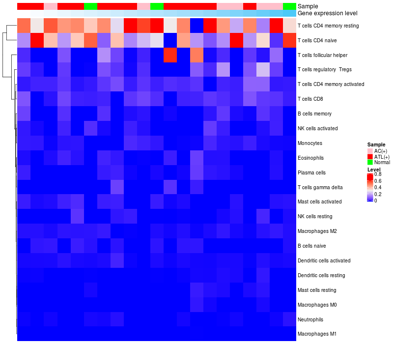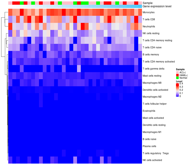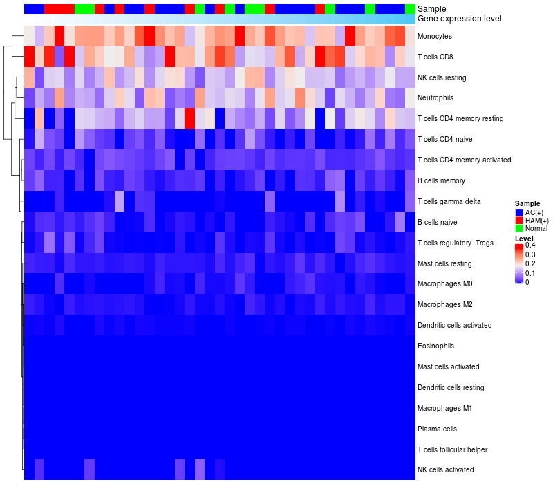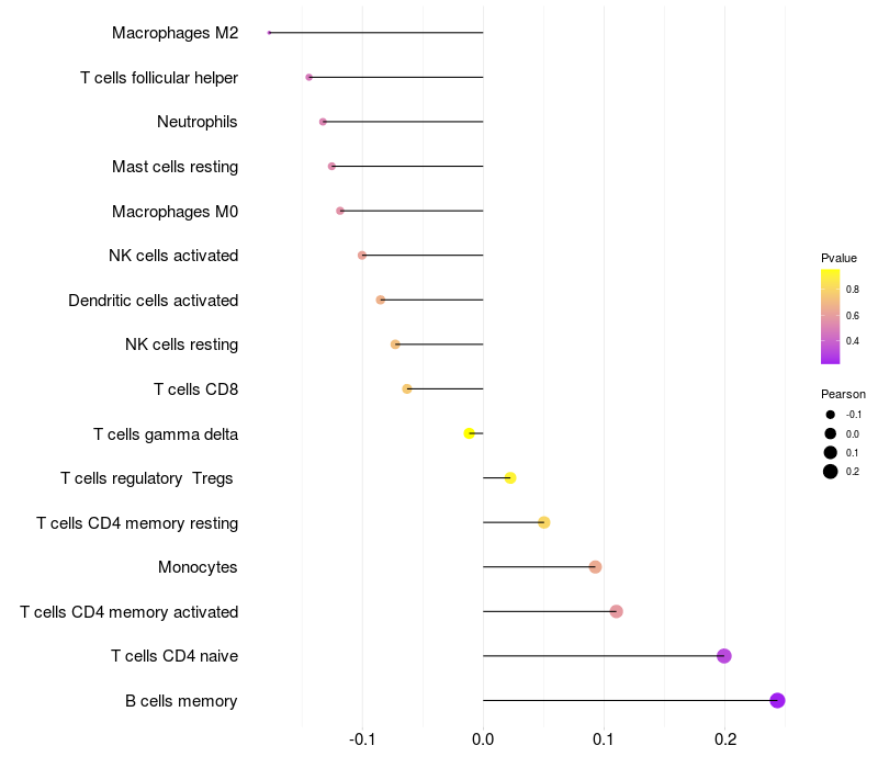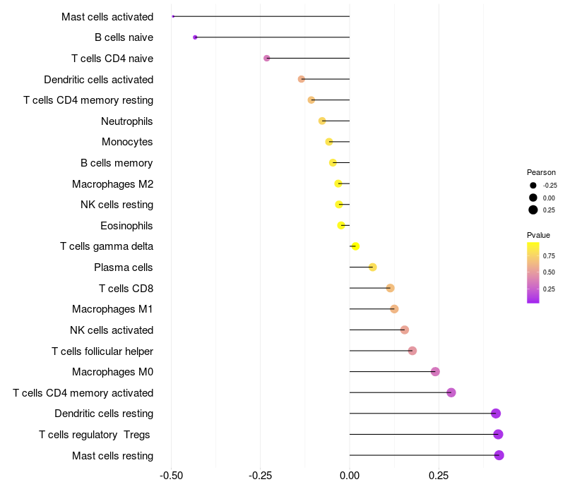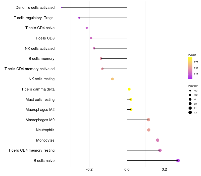 Lollipop of GUCA1A expression and immune infiltrating cell level correlation result in HTLV1+ samples
