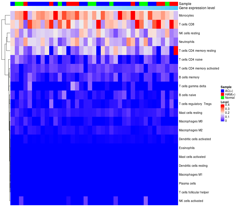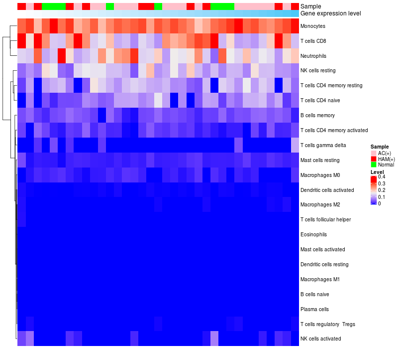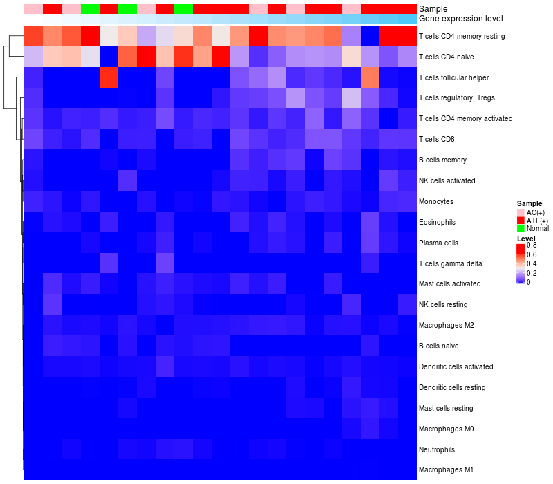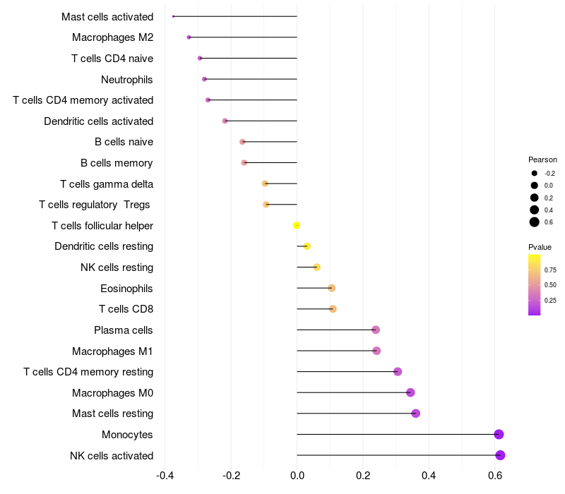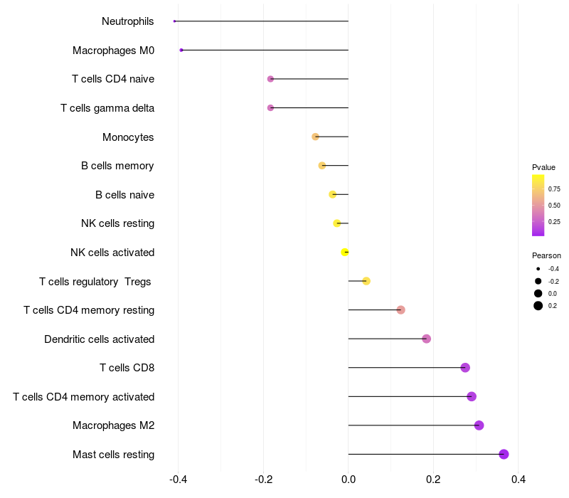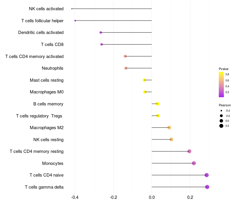 Lollipop of GUCY1B2 expression and immune infiltrating cell level correlation result in HTLV1+ samples