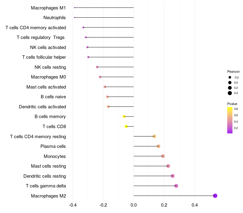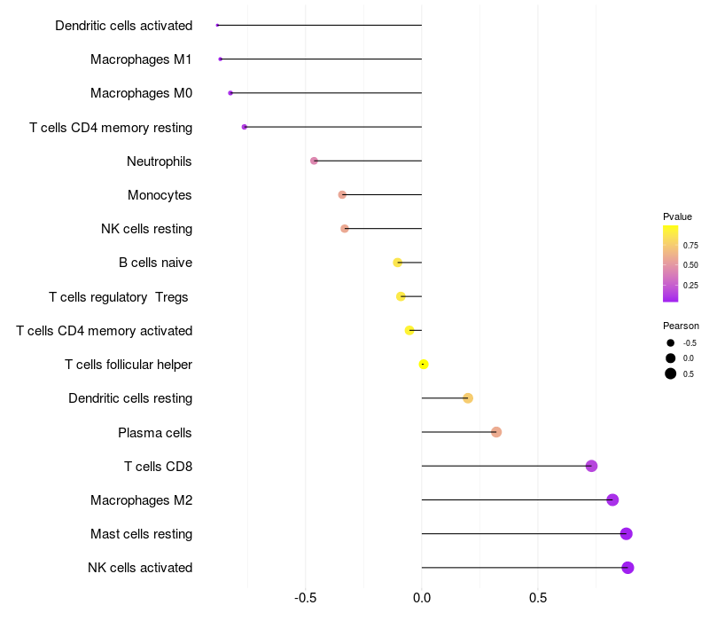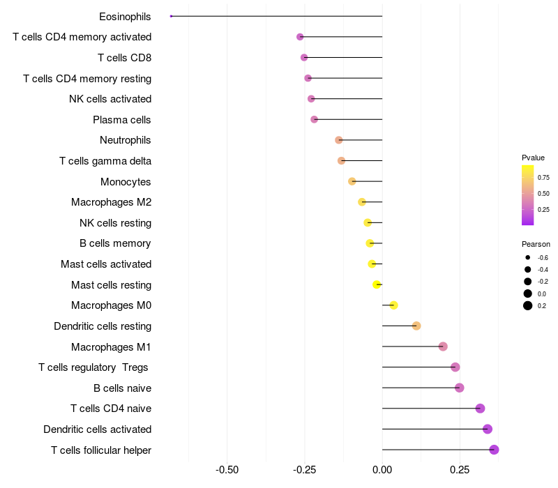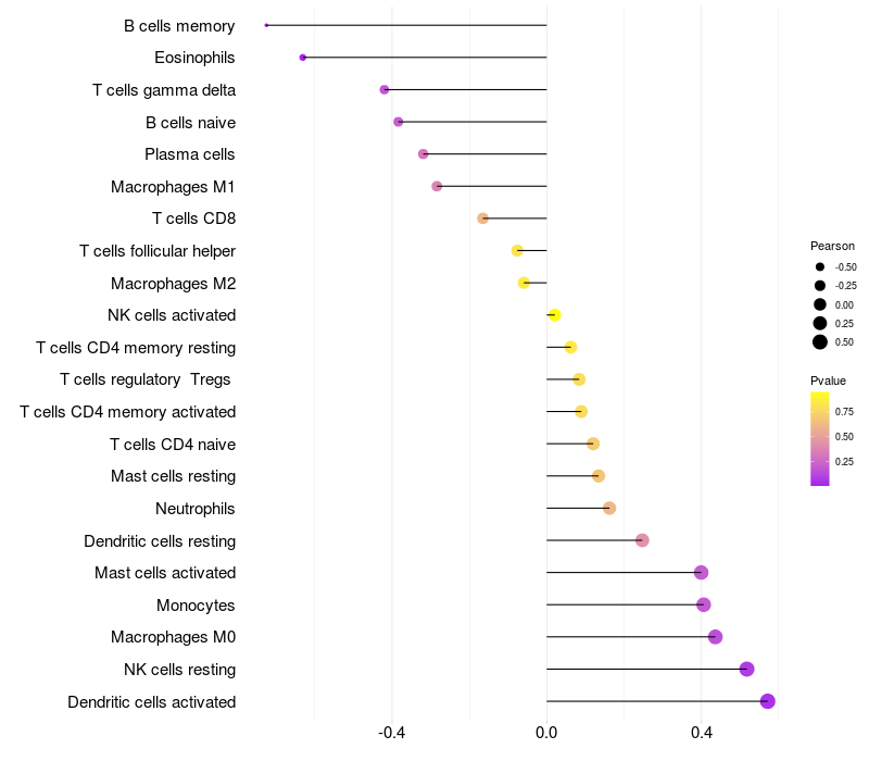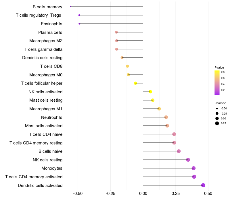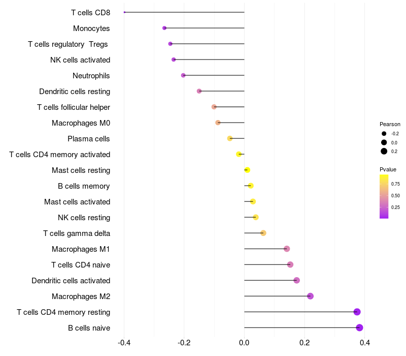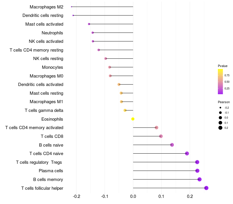 Lollipop of GXYLT1 expression and immune infiltrating cell level correlation result in HPV+ samples