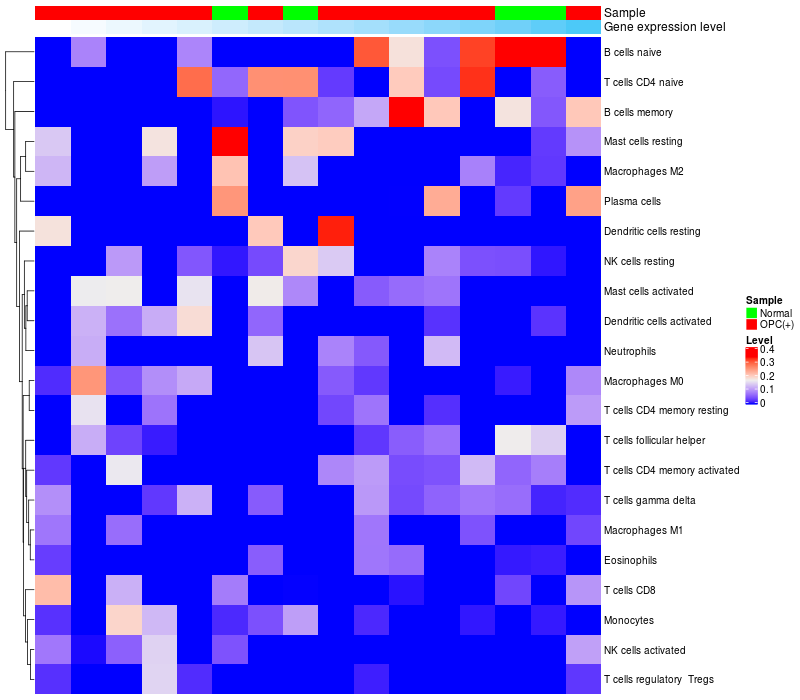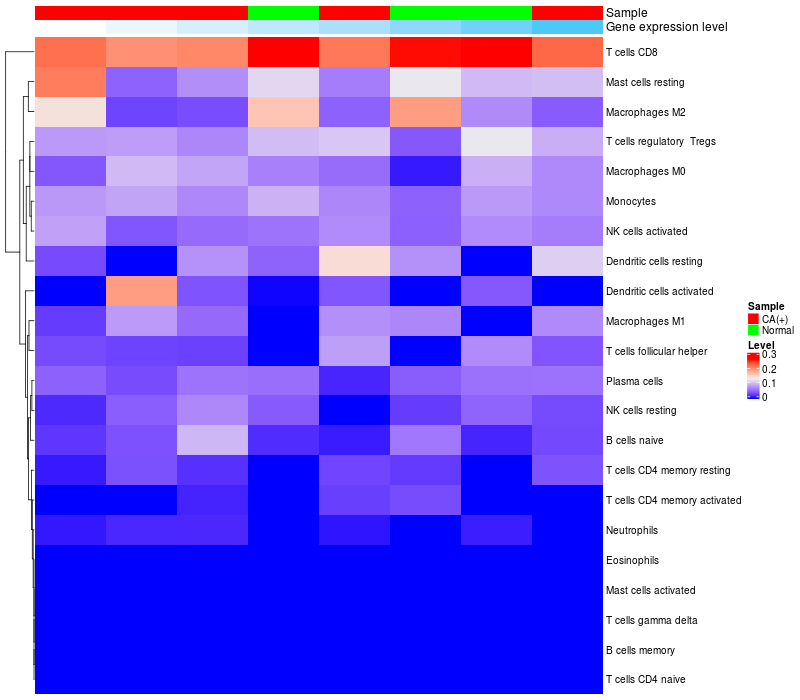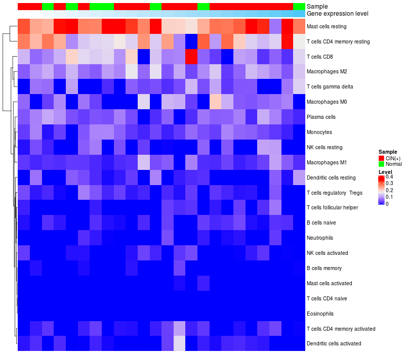 • Left: Heatmap of target gene expression and the level of various types of immune cells (cell type fractions) in all samples based on CIBERSORT method.