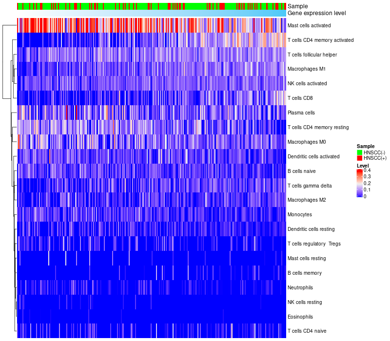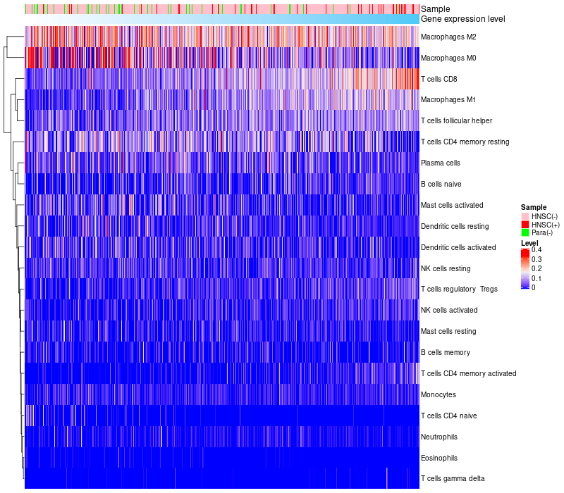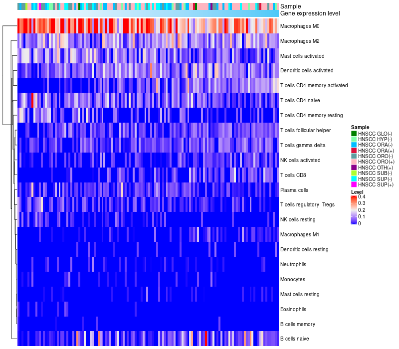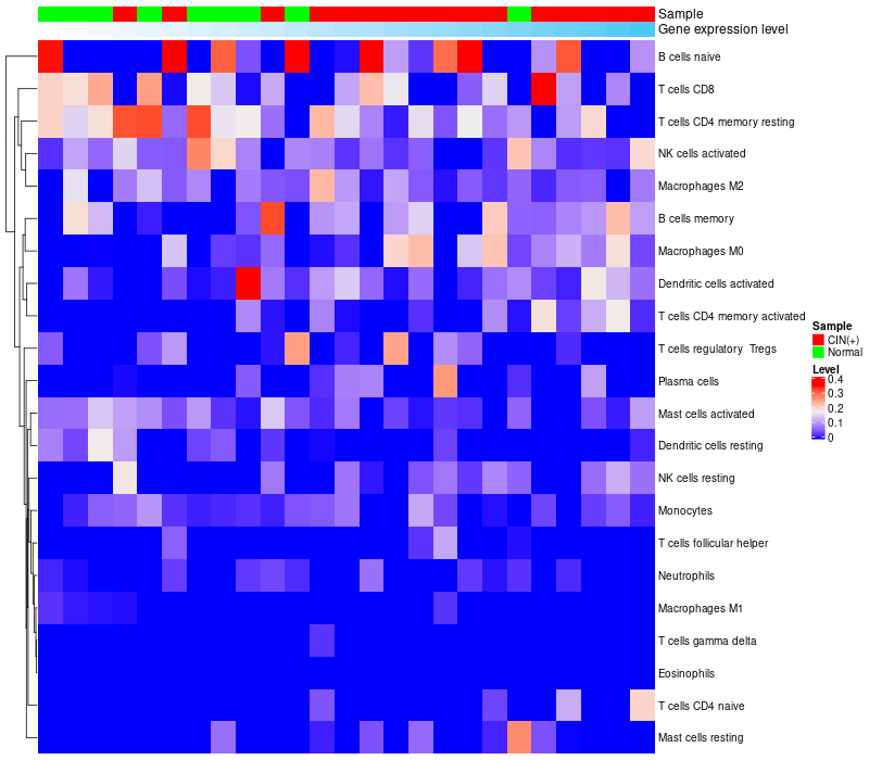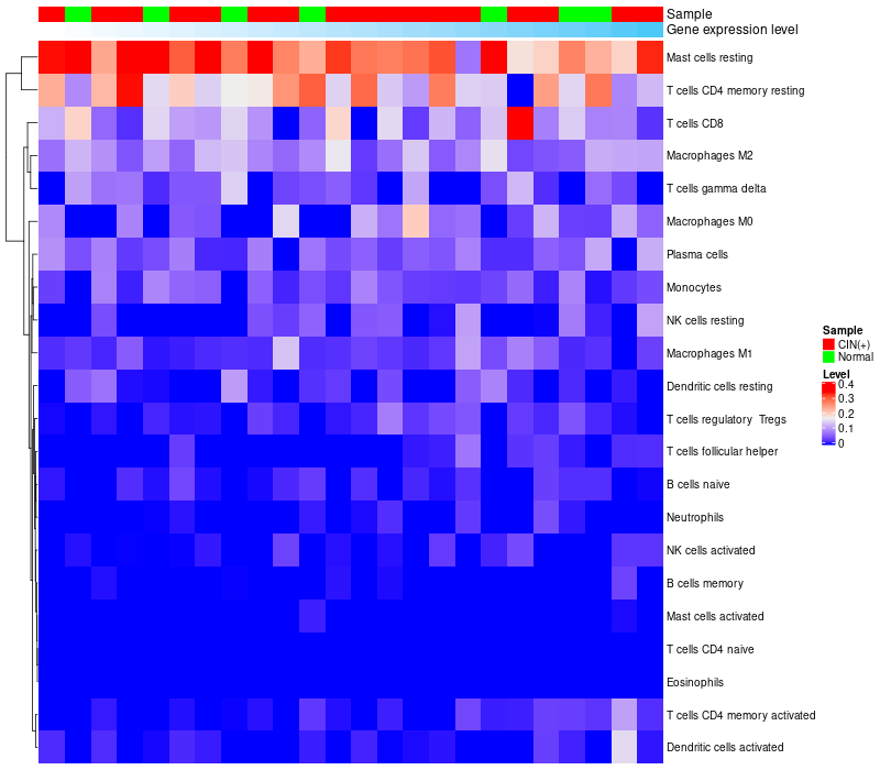 • Left: Heatmap of target gene expression and the level of various types of immune cells (cell type fractions) in all samples based on CIBERSORT method.