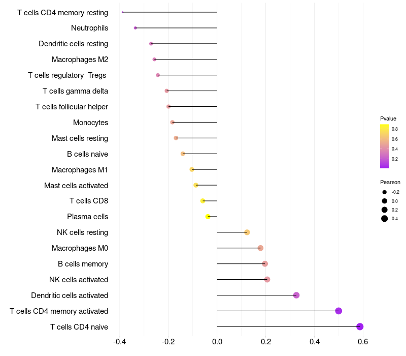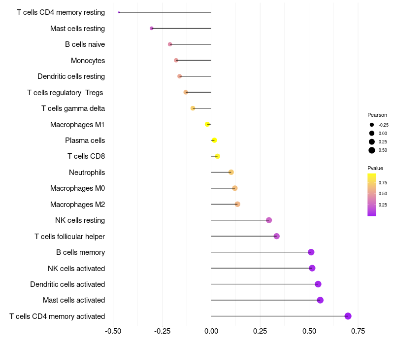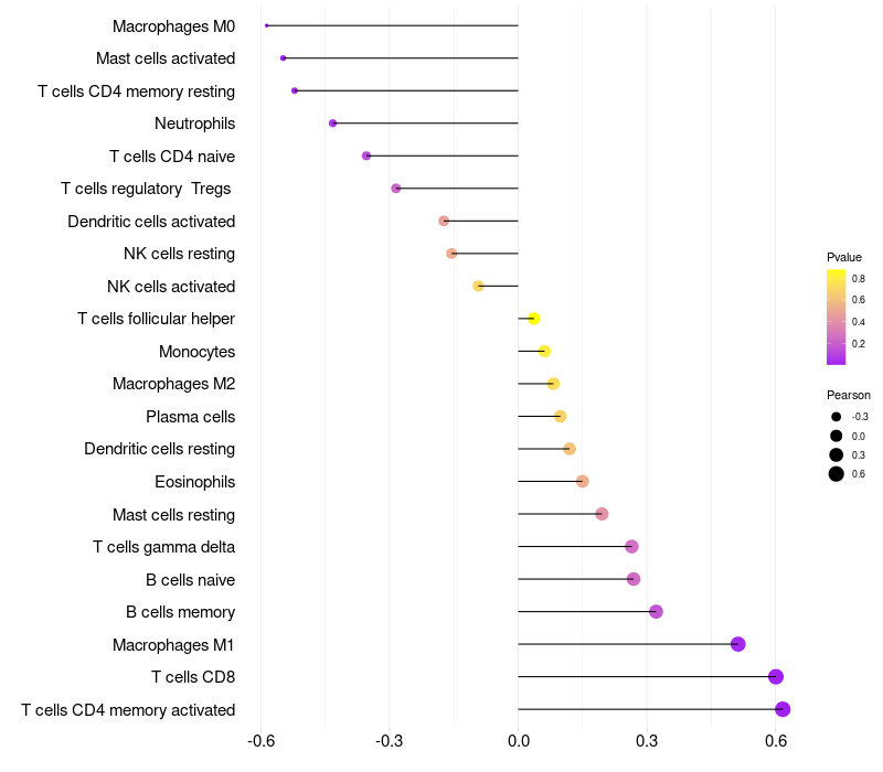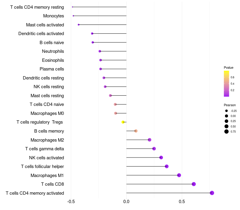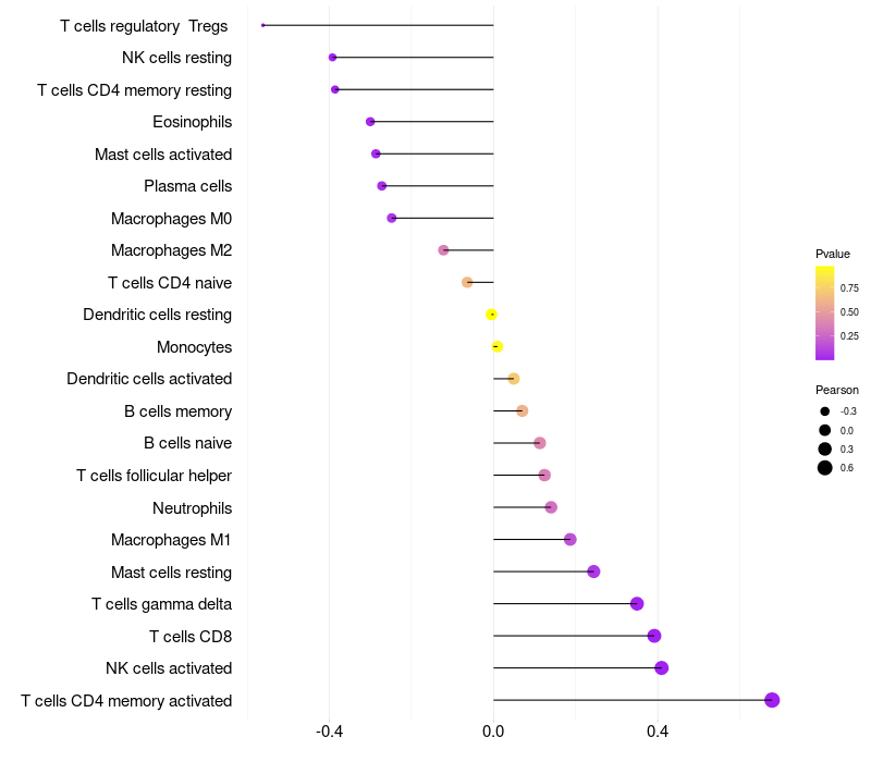 • Right: Correlation of target gene expression and the level of various types of immune cells in virus positive samples (Pearson Correlation Coefficient).