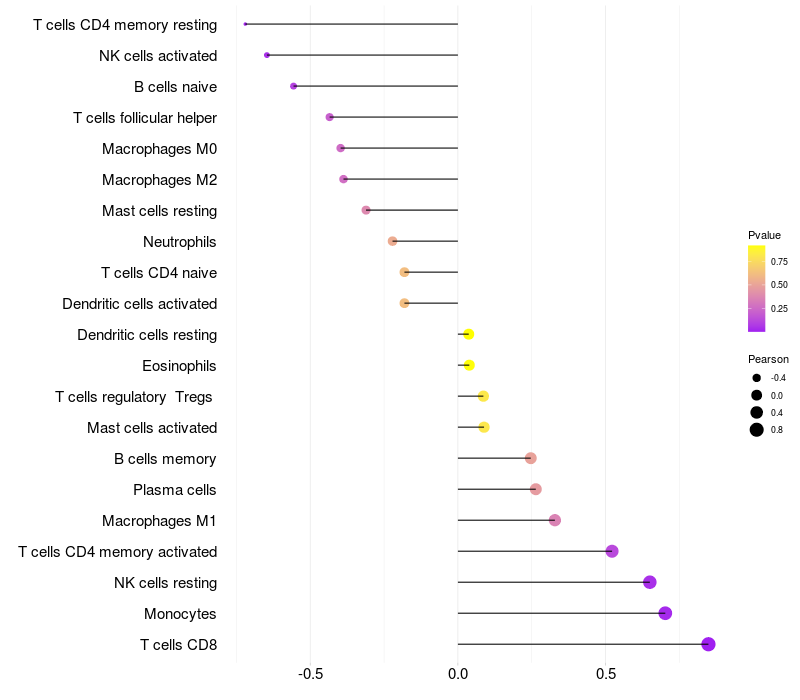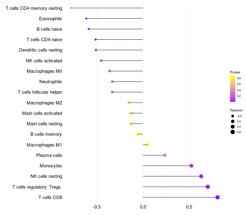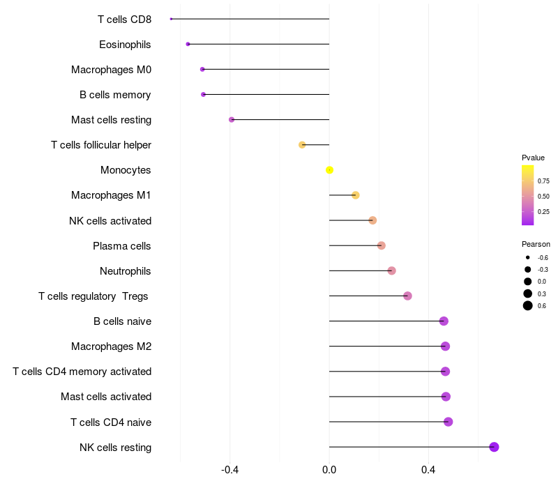 Lollipop of HABP2 expression and immune infiltrating cell level correlation result in HBV+ Chronic HBV (CHB) infection samples