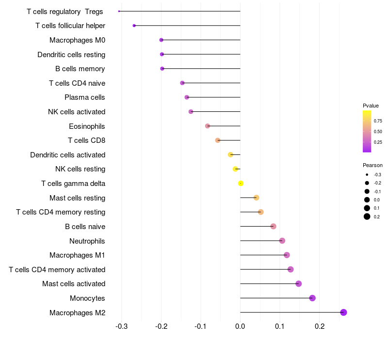 Lollipop of HABP2 expression and immune infiltrating cell level correlation result in HBV+ Liver cirrhosis samples