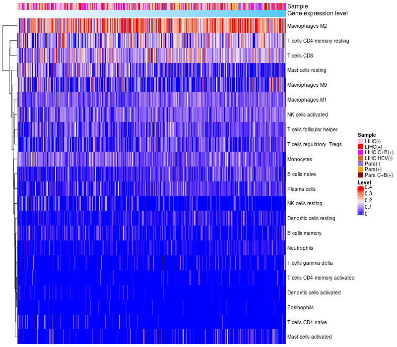Liver hepatocellular carcinoma HCV (HBV+)(86), Liver hepatocellular carcinoma HCV (HBV-)(19), Liver hepatocellular carcinoma (HBV+)(209), Liver hepatocellular carcinoma (HBV+)(60), Paracancerous HCV (HBV+)(4), Paracancerous (HBV-)(28), Paracancerous (HBV+)(18) |