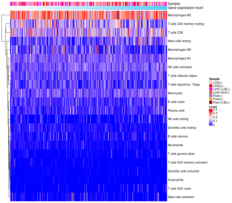 Liver hepatocellular carcinoma HCV (HBV+)(86), Liver hepatocellular carcinoma HCV (HBV-)(19), Liver hepatocellular carcinoma (HBV+)(209), Liver hepatocellular carcinoma (HBV+)(60), Paracancerous HCV (HBV+)(4), Paracancerous (HBV-)(28), Paracancerous (HBV+)(18) |
