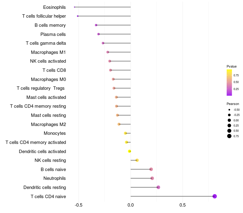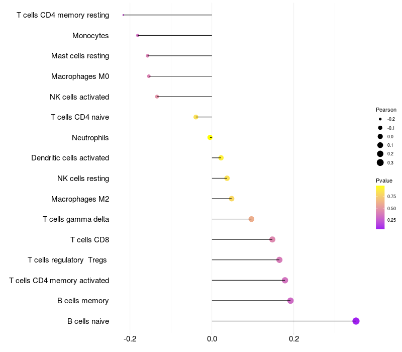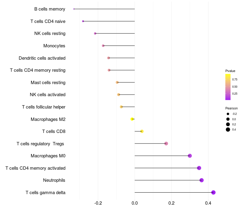 Lollipop of HEBP1 expression and immune infiltrating cell level correlation result in HTLV1+ samples
