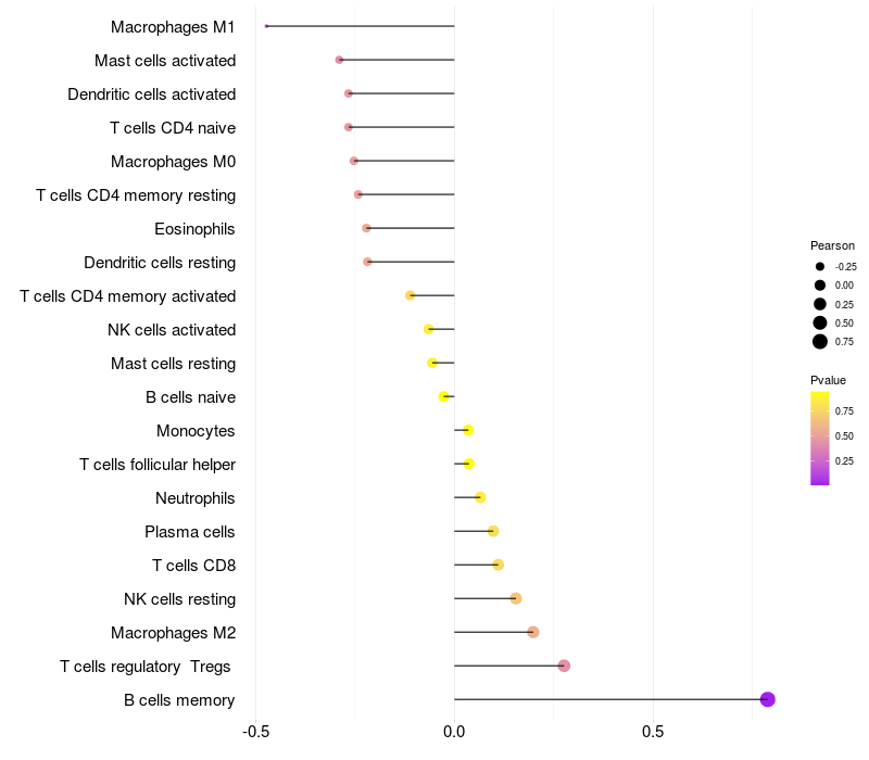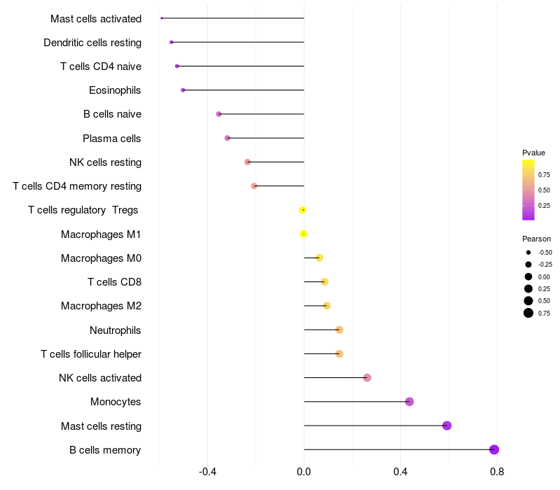 Lollipop of HELZ expression and immune infiltrating cell level correlation result in HBV+ Liver cirrhosis samples
