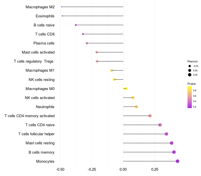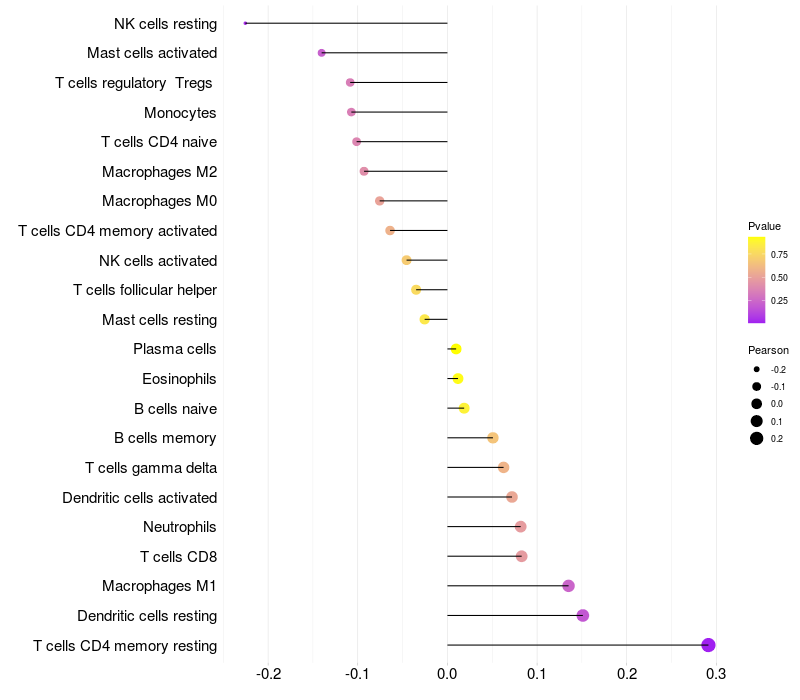 Lollipop of HELZ expression and immune infiltrating cell level correlation result in HBV+ Chronic HBV (CHB) infection samples