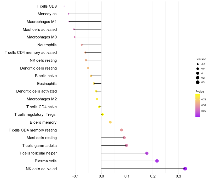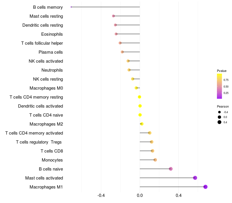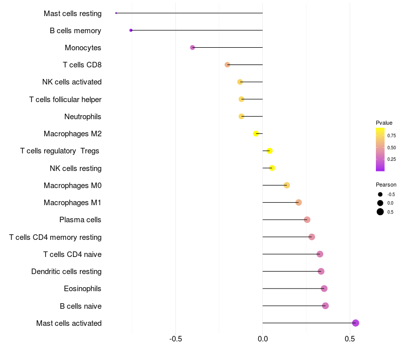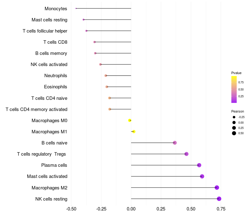 Lollipop of HES5 expression and immune infiltrating cell level correlation result in HBV+ Liver cirrhosis samples