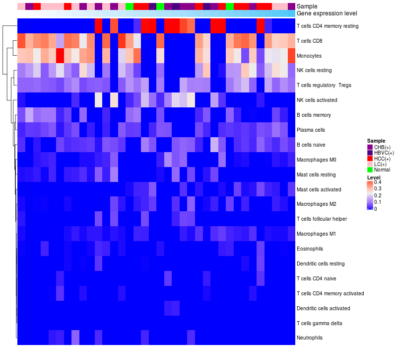 Chronic hepatitis B patients (HBV+)(10),Hepatocellular carcinoma (HBV+)(10),Liver cirrhosis(HBV+)(10),Normal(3),HBV carriers (3) |