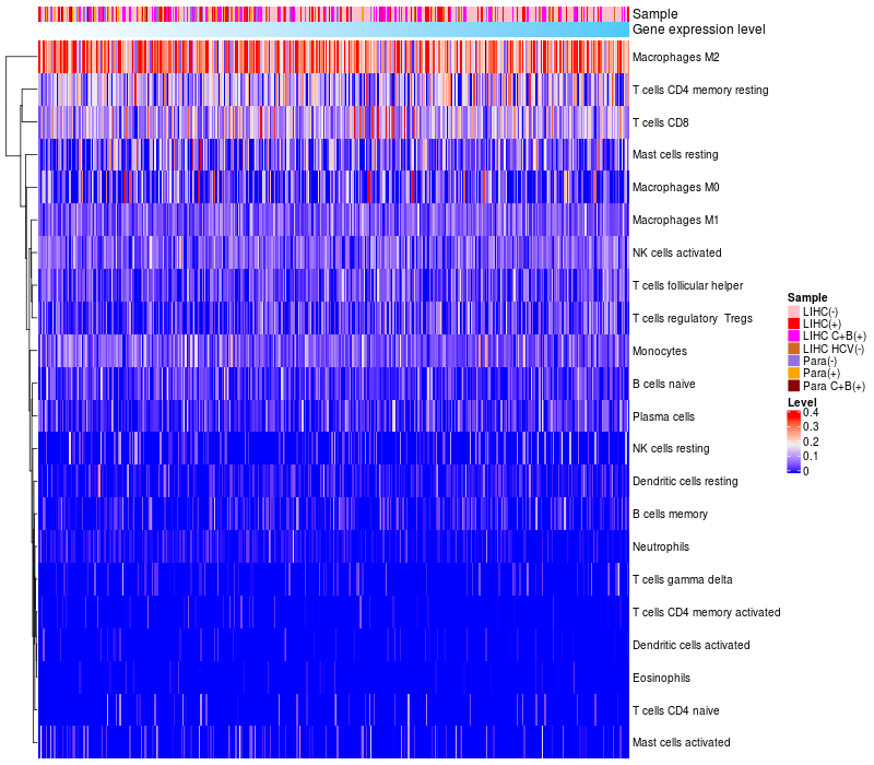 Liver hepatocellular carcinoma HCV (HBV+)(86), Liver hepatocellular carcinoma HCV (HBV-)(19), Liver hepatocellular carcinoma (HBV+)(209), Liver hepatocellular carcinoma (HBV+)(60), Paracancerous HCV (HBV+)(4), Paracancerous (HBV-)(28), Paracancerous (HBV+)(18) |