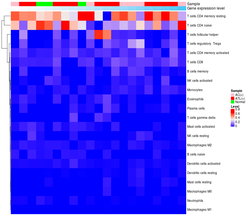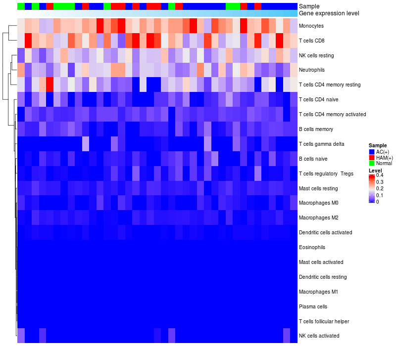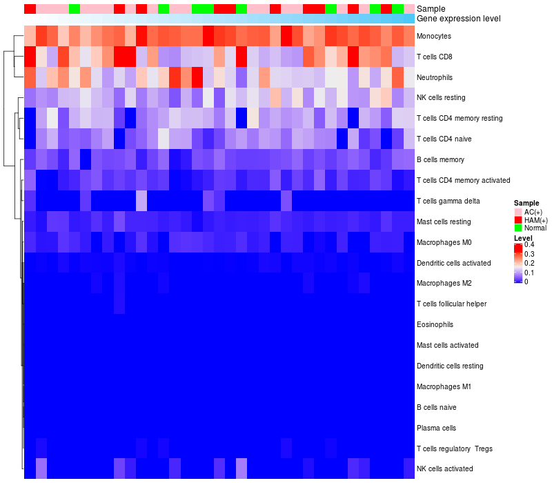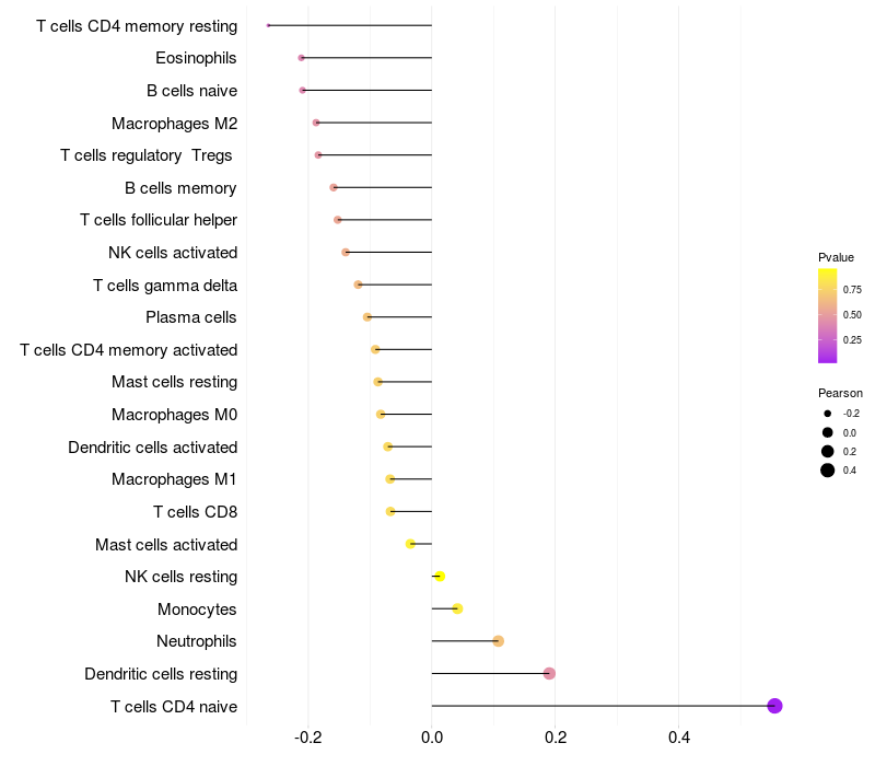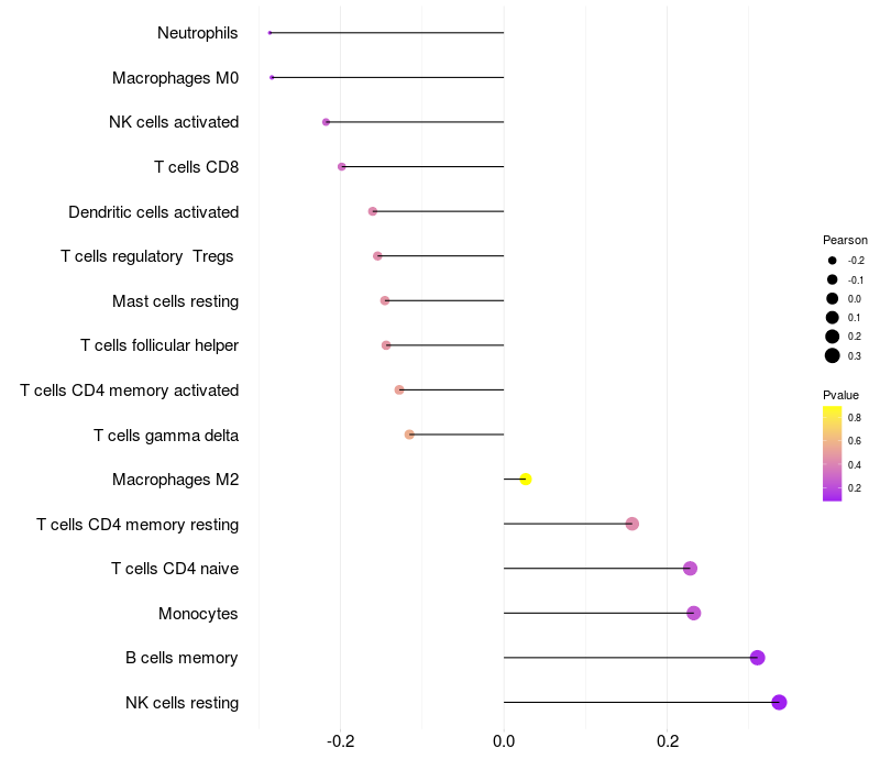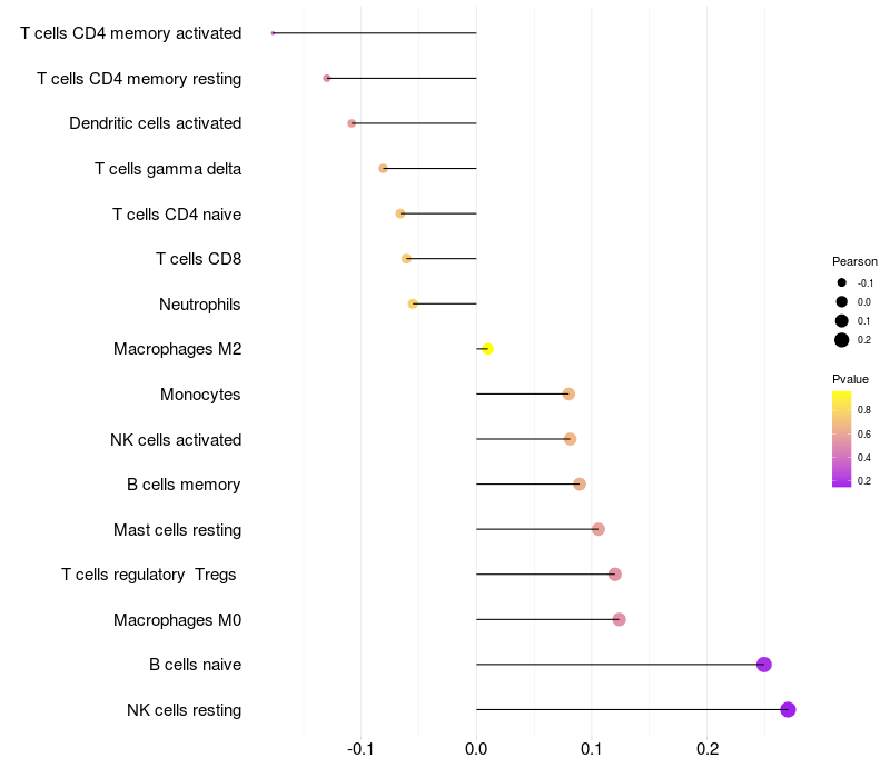 Lollipop of HEYL expression and immune infiltrating cell level correlation result in HTLV1+ samples