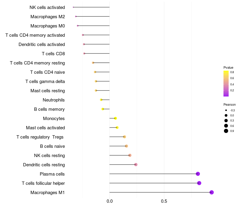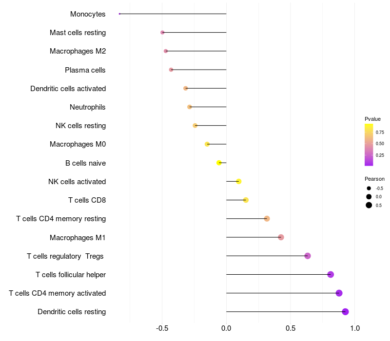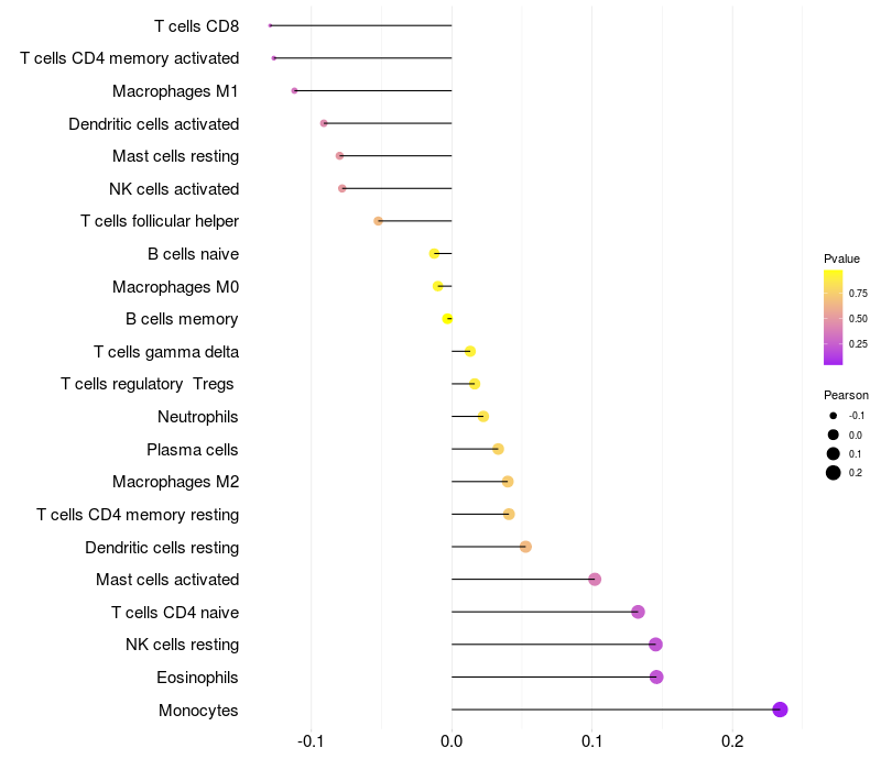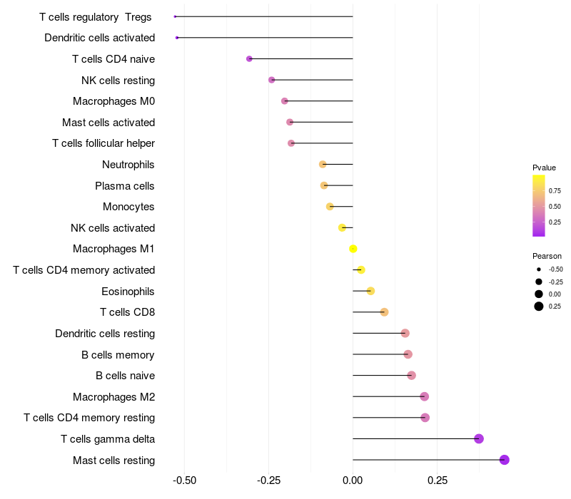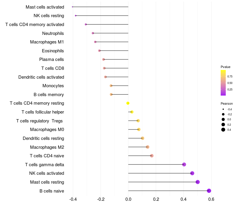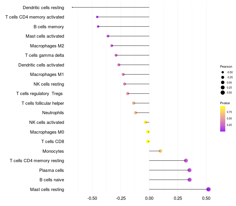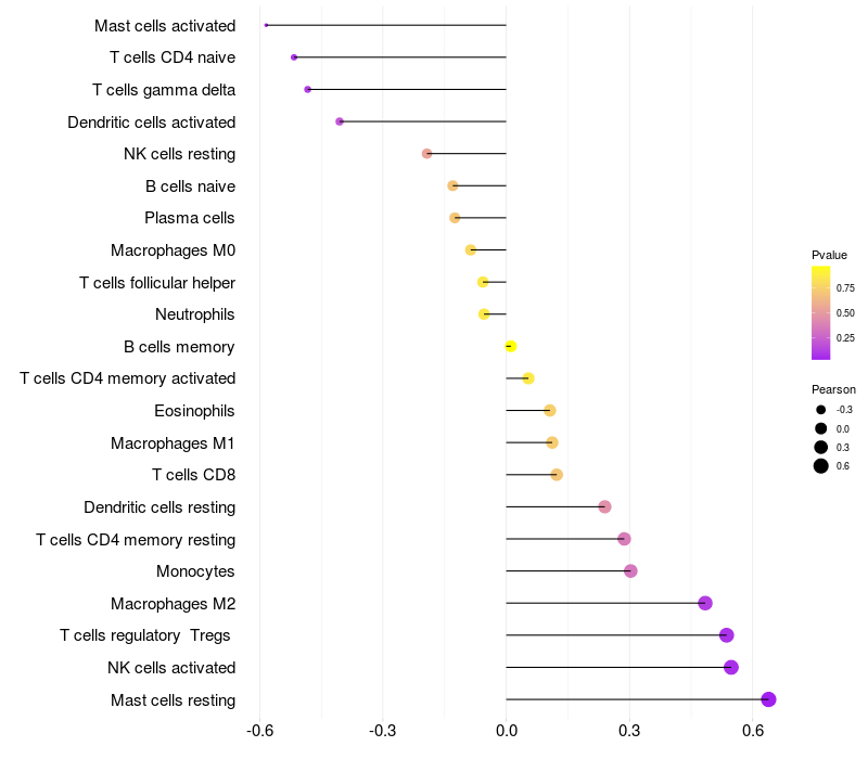 Lollipop of HGD expression and immune infiltrating cell level correlation result in HPV+ samples