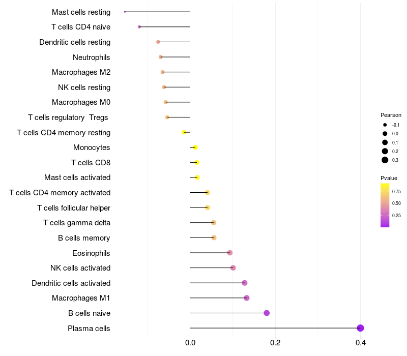 Lollipop of HGSNAT expression and immune infiltrating cell level correlation result in HBV+ samples