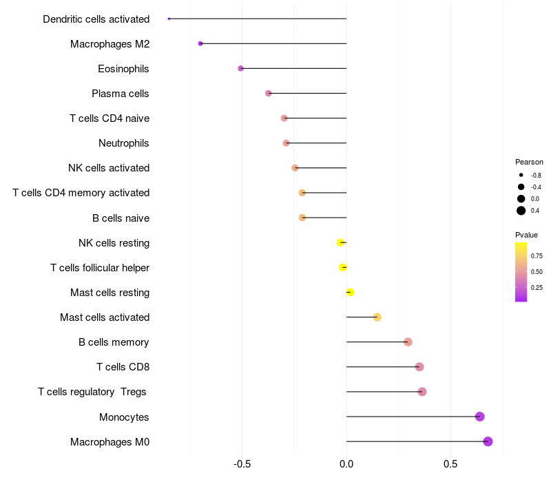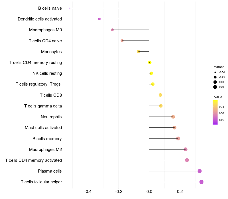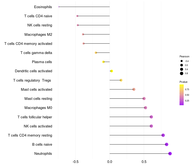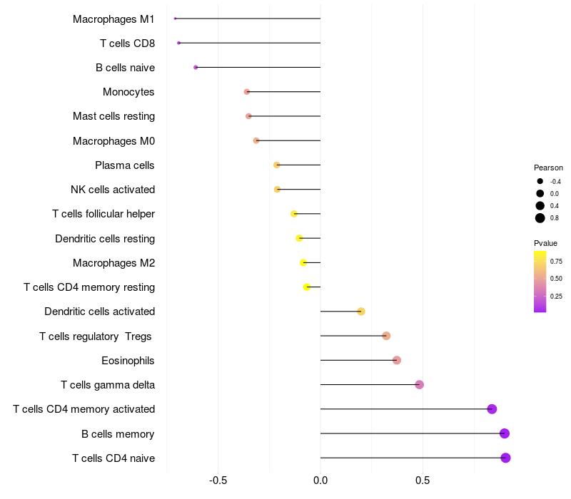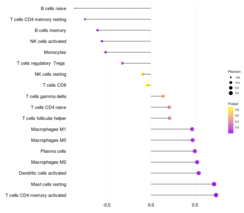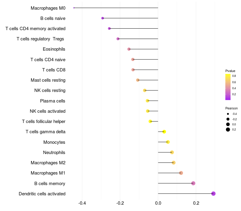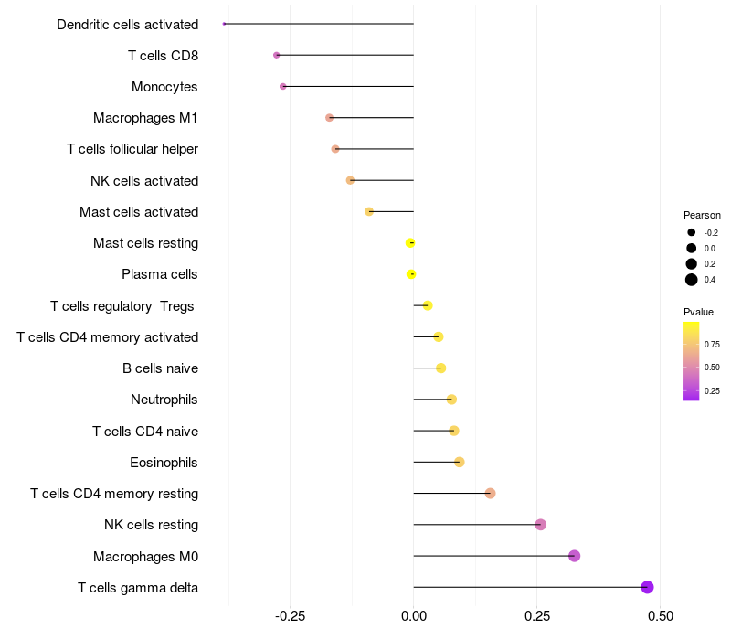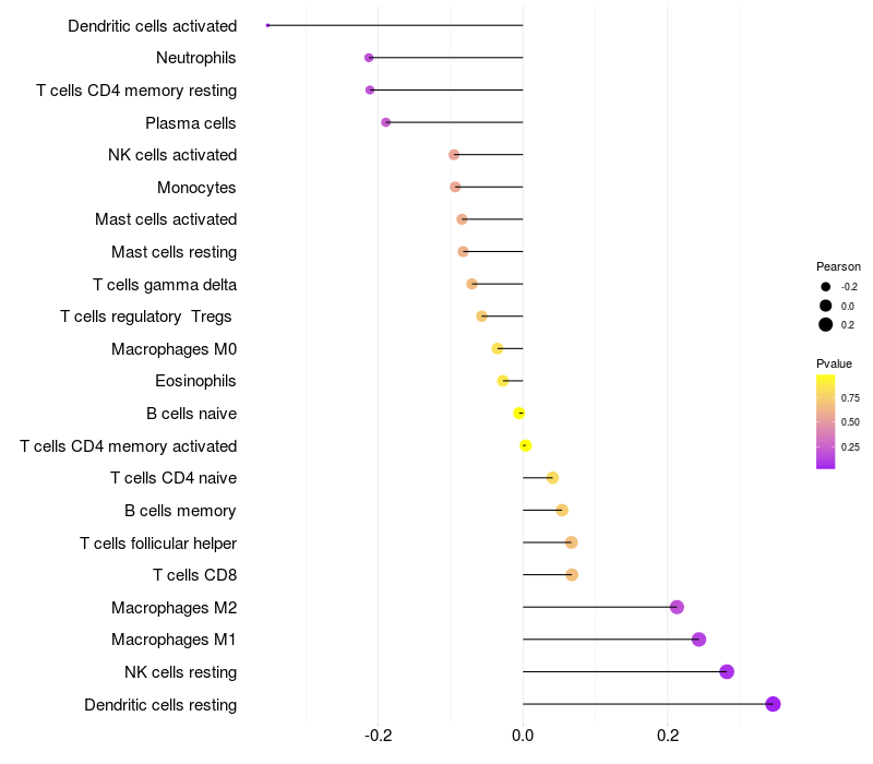 Lollipop of HHIP expression and immune infiltrating cell level correlation result in EBV+ samples