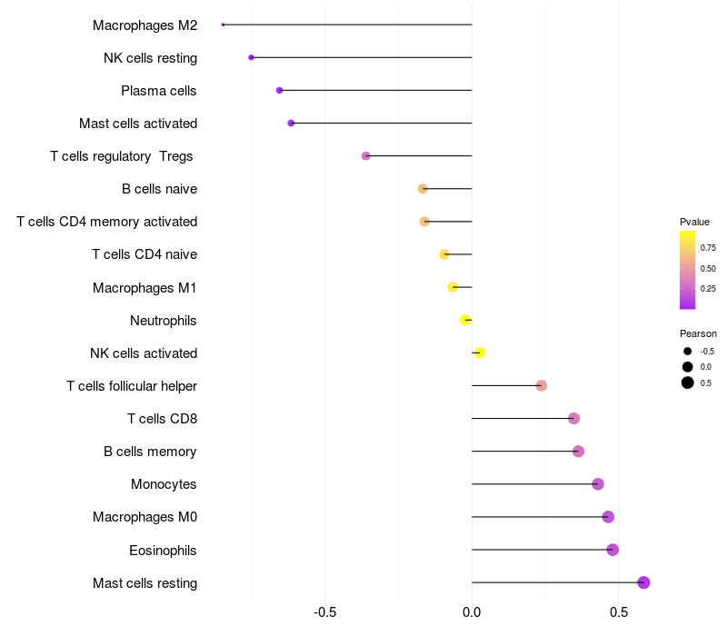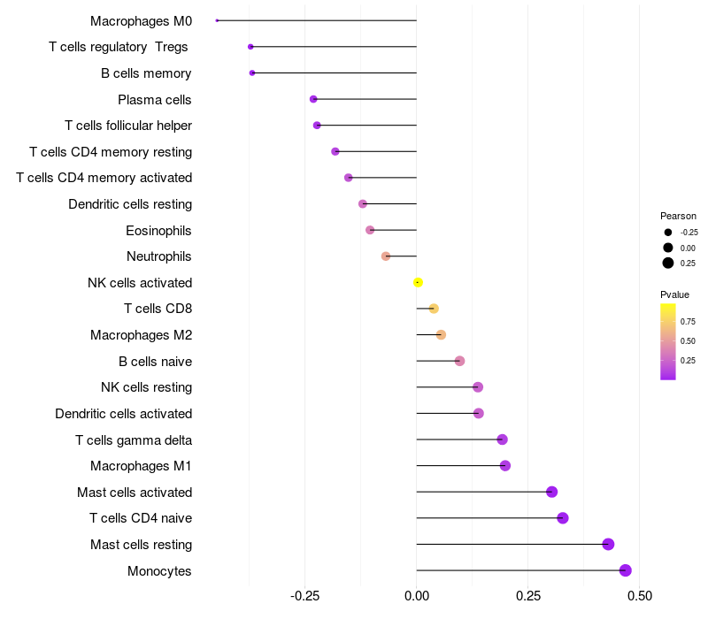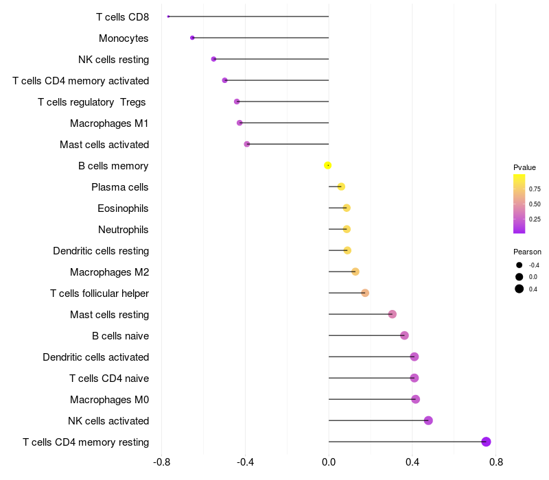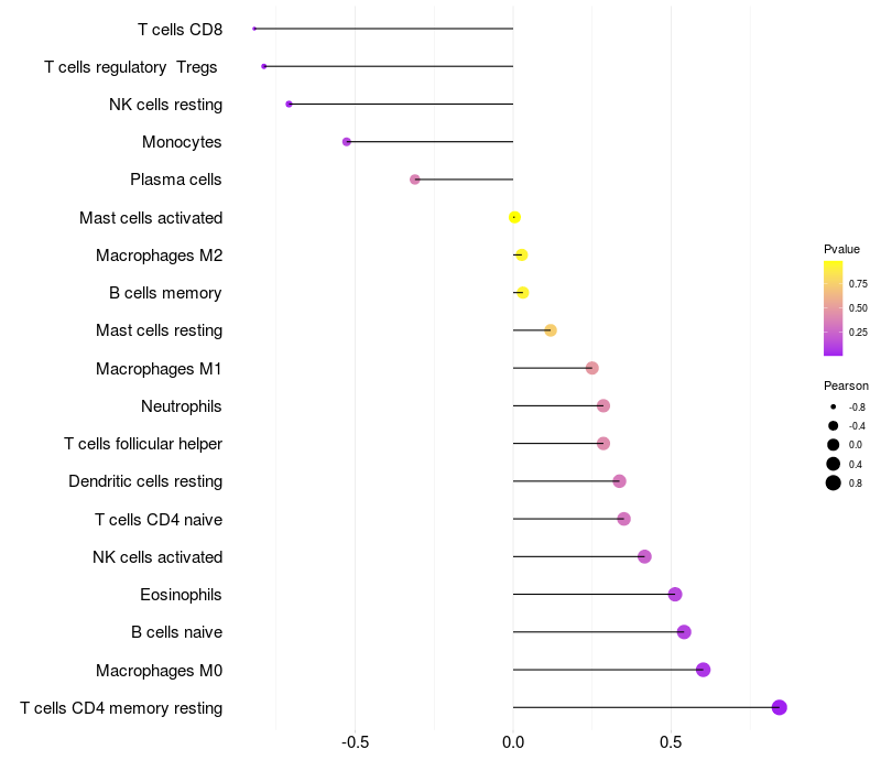 Lollipop of HIBADH expression and immune infiltrating cell level correlation result in HBV+ Liver cirrhosis samples