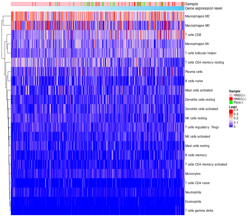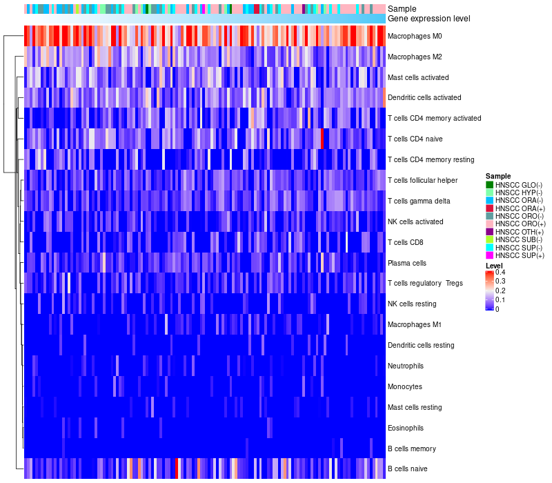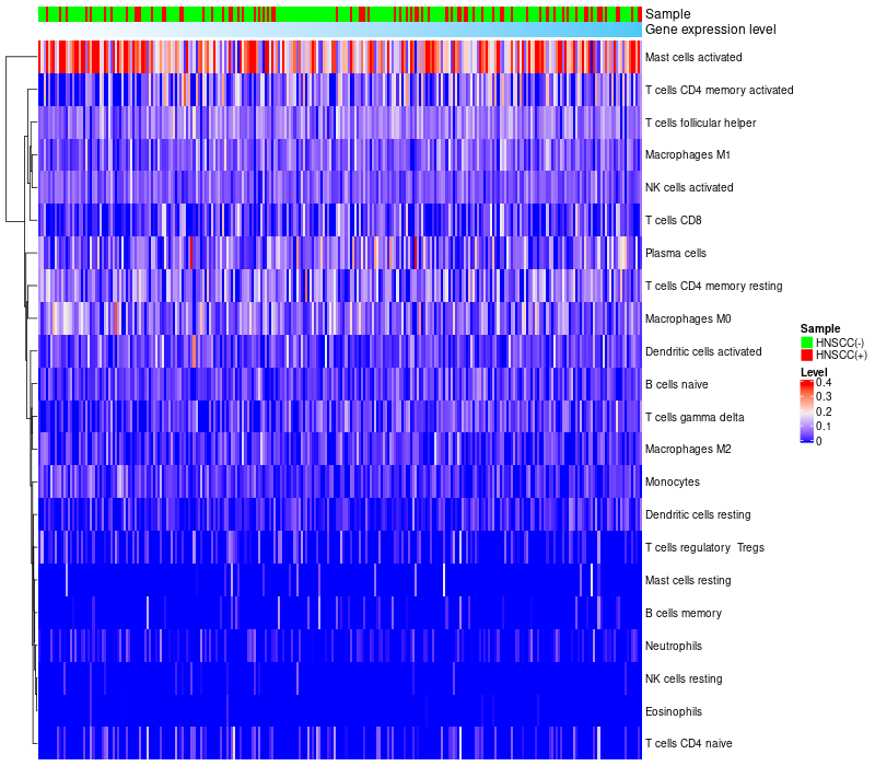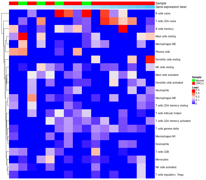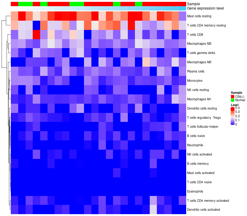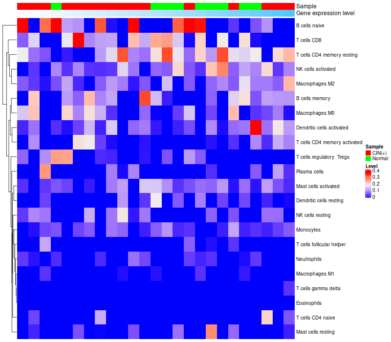 • Left: Heatmap of target gene expression and the level of various types of immune cells (cell type fractions) in all samples based on CIBERSORT method.