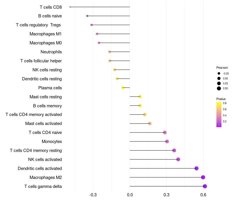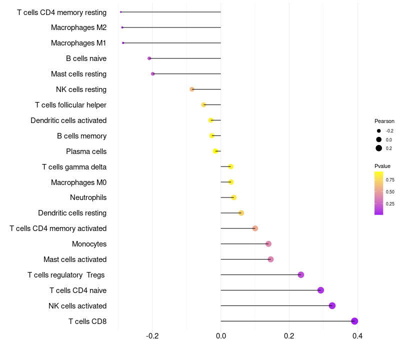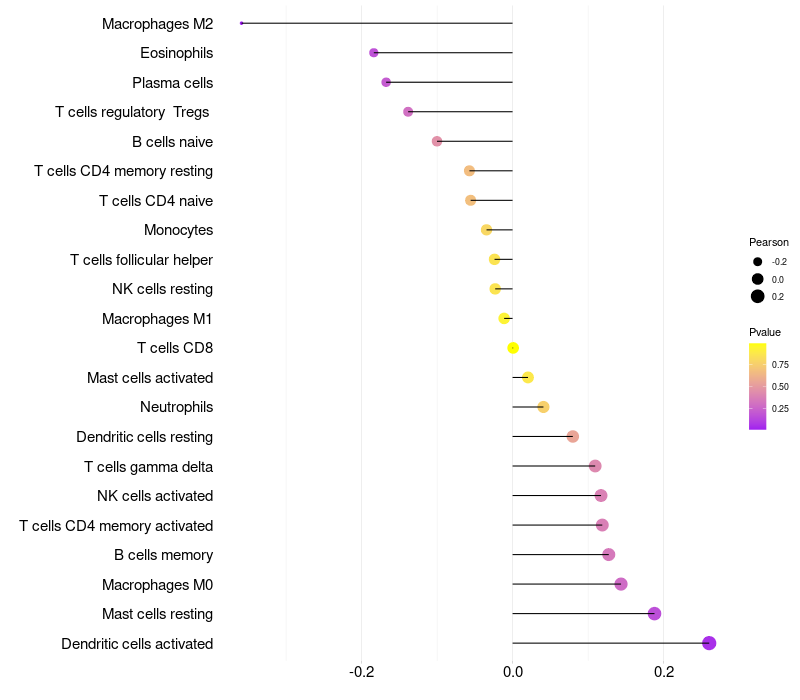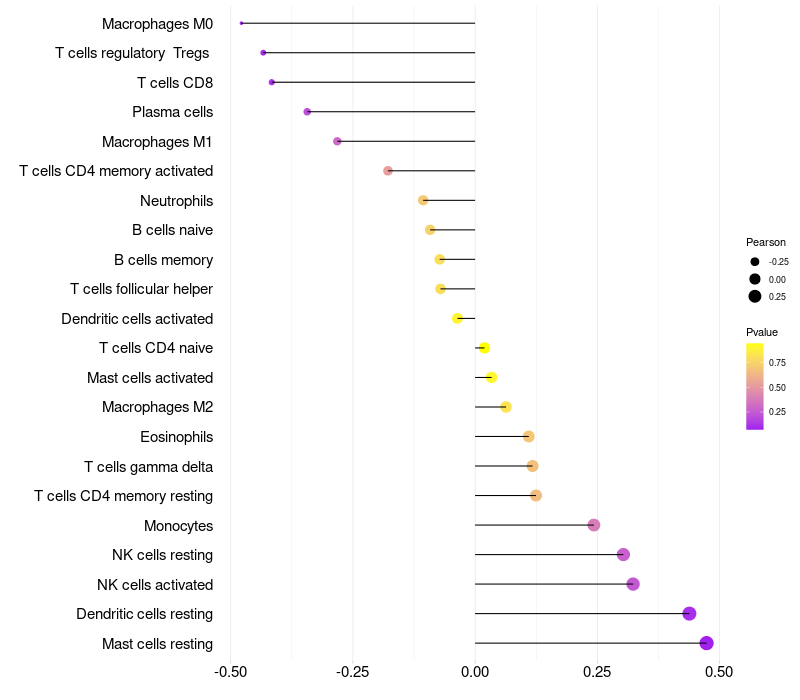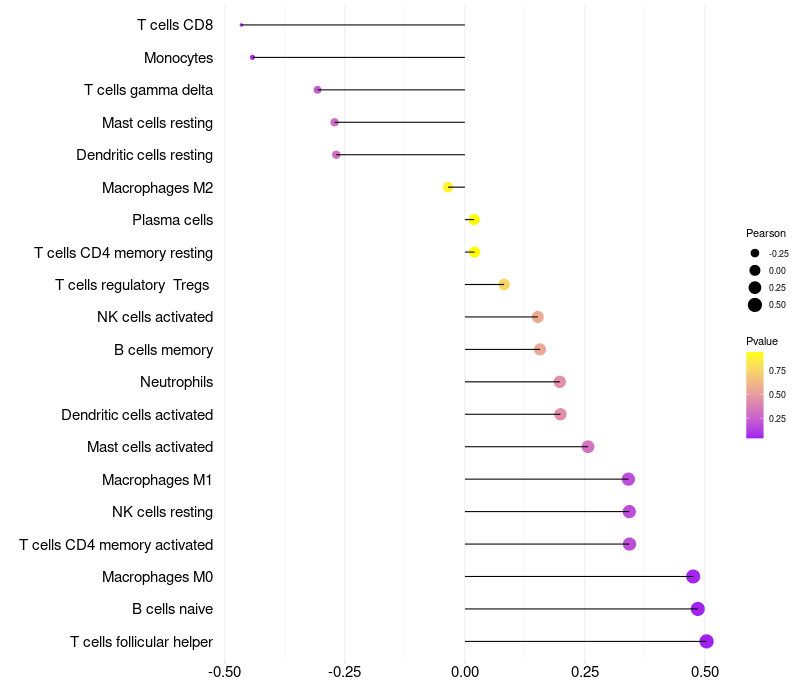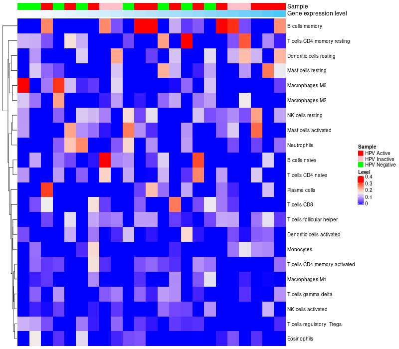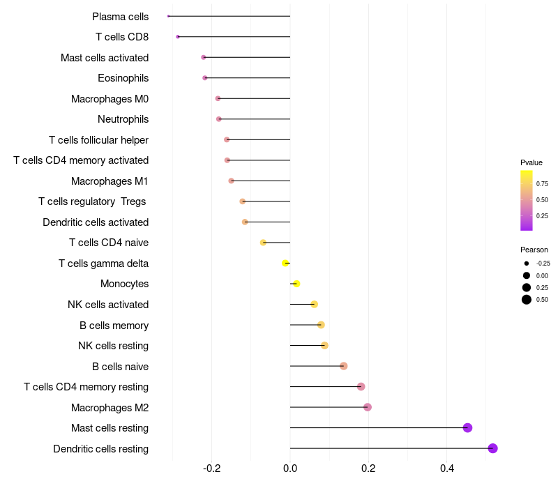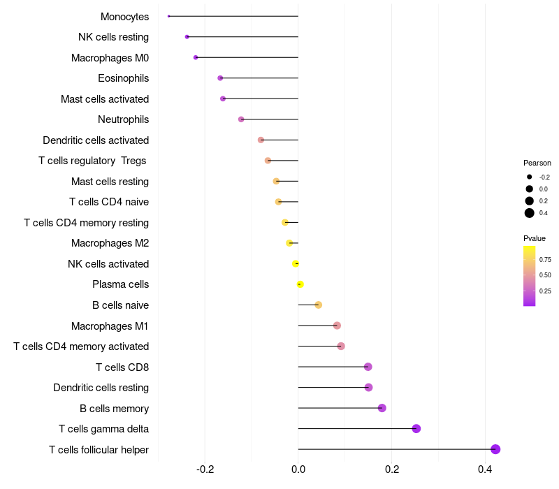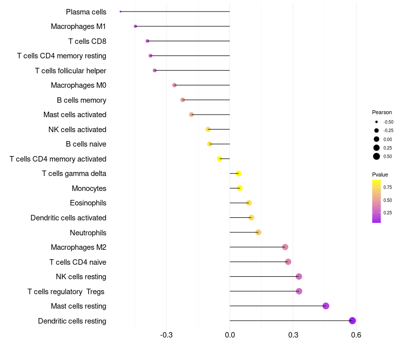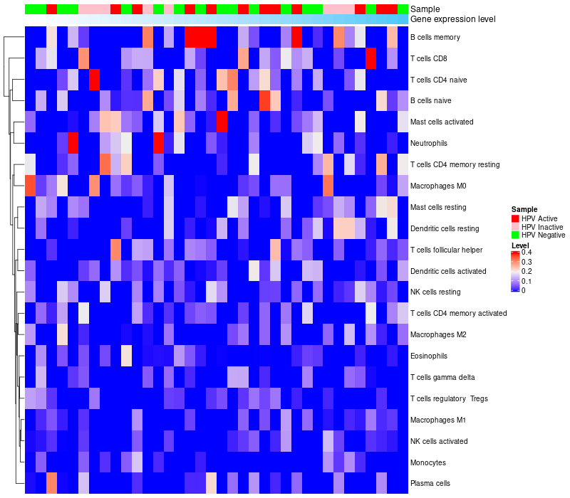 HeatMap of cell type fractions in all samples Lollipop of HINT1 expression and immune infiltrating cell level correlation result in HPV+ samples