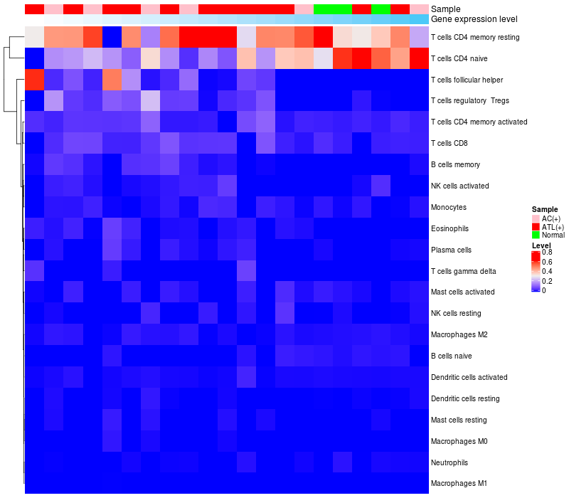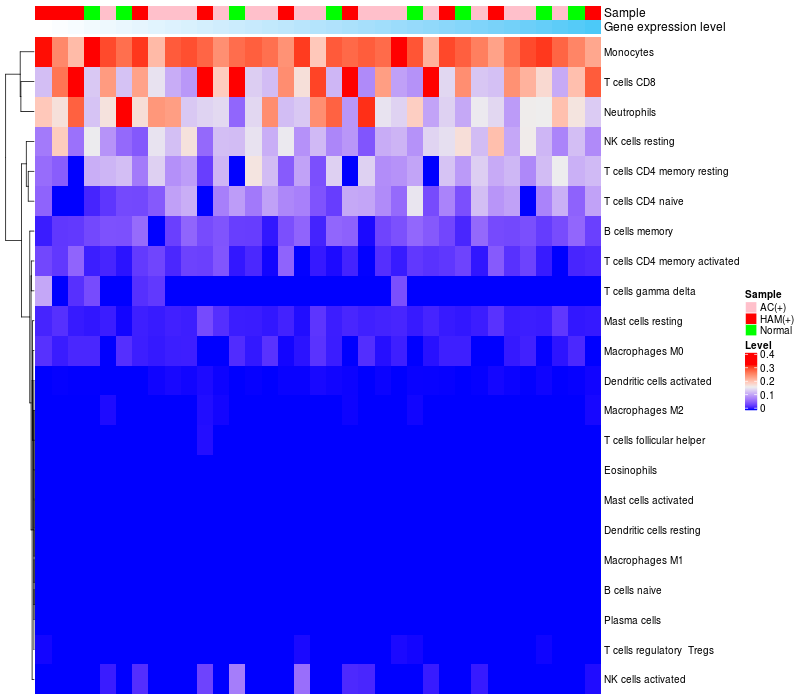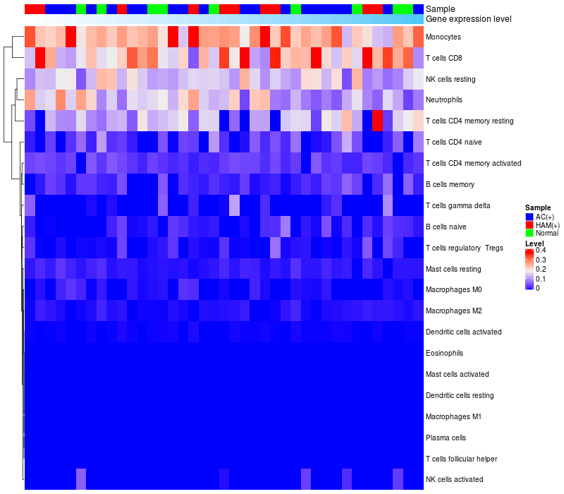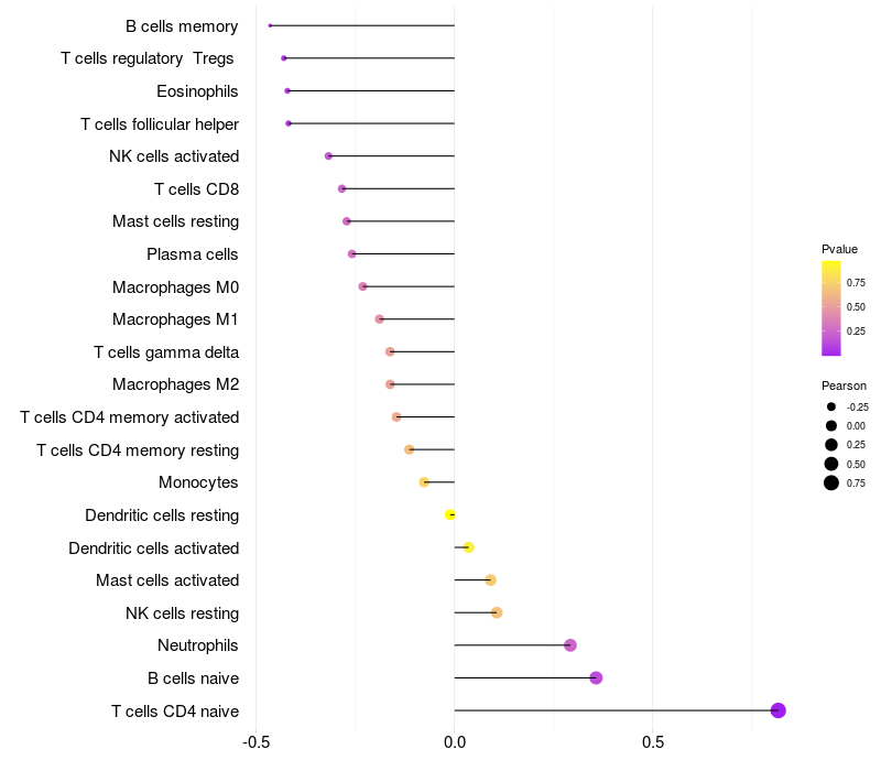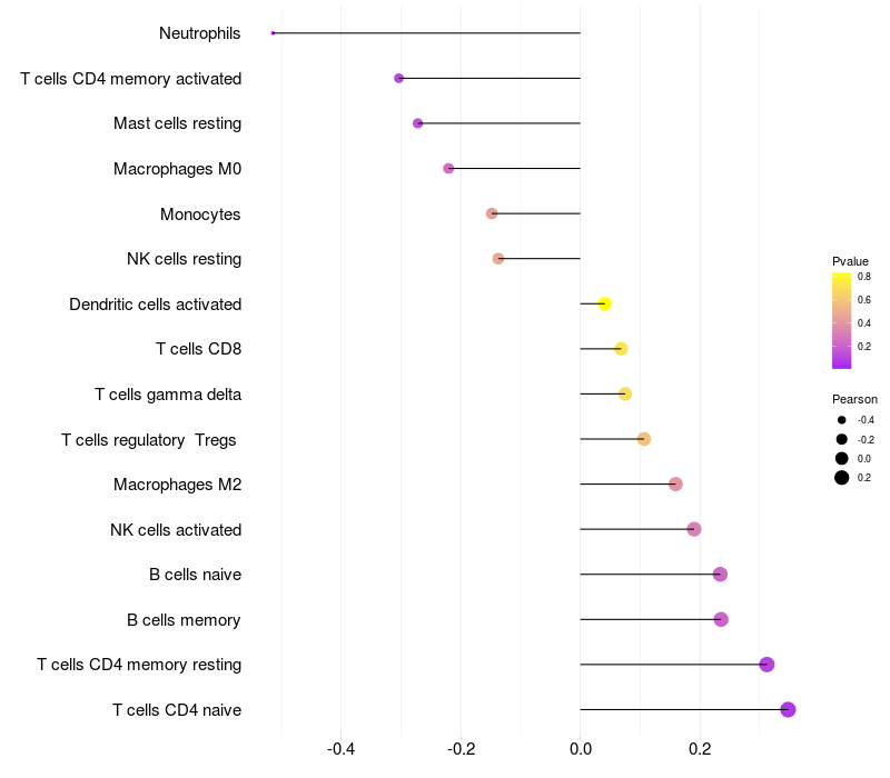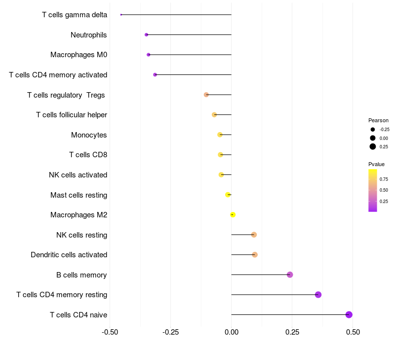 Lollipop of HIP1R expression and immune infiltrating cell level correlation result in HTLV1+ samples