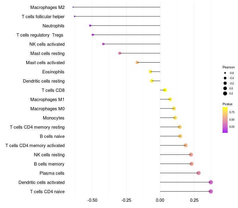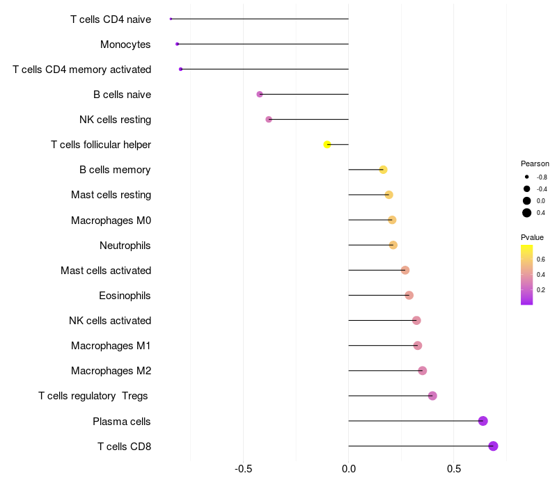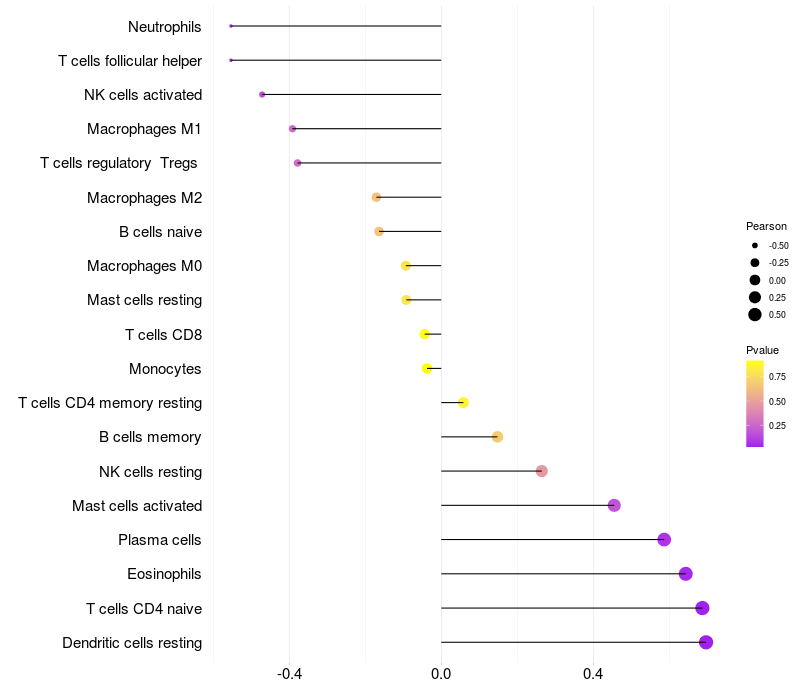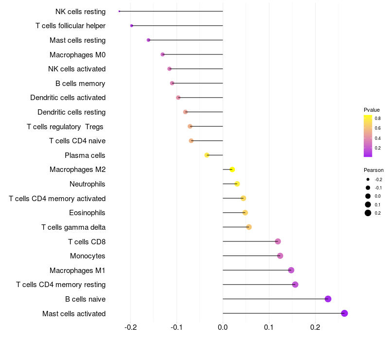Lollipop of HIVEP2 expression and immune infiltrating cell level correlation result in HBV+ Liver cirrhosis samples