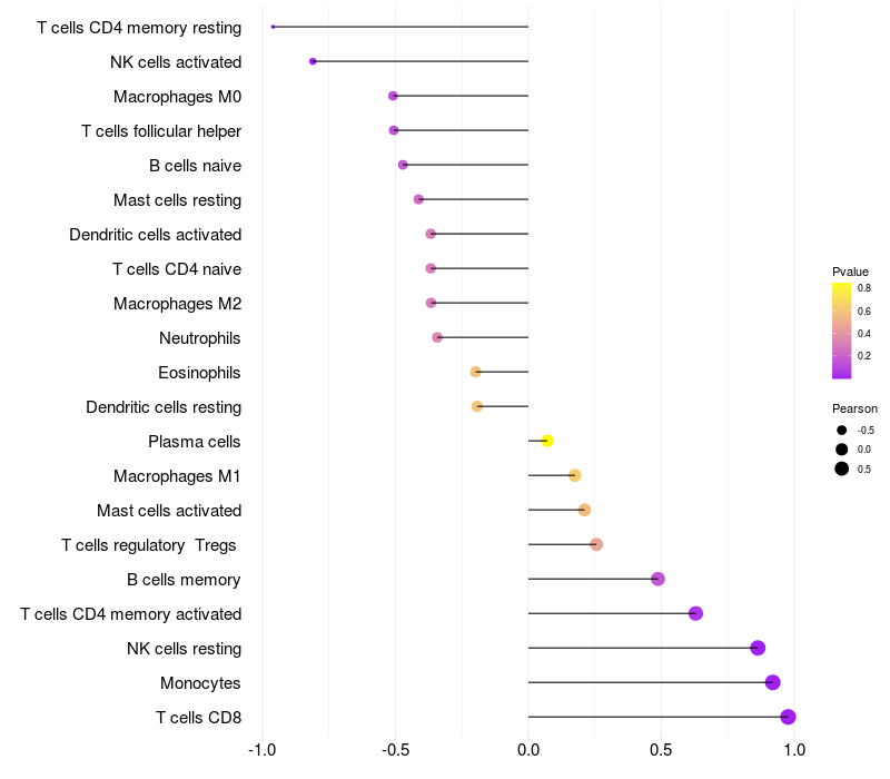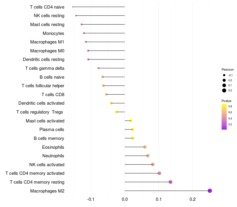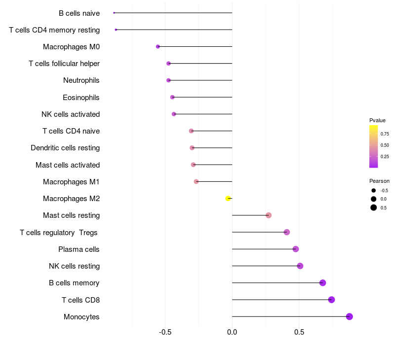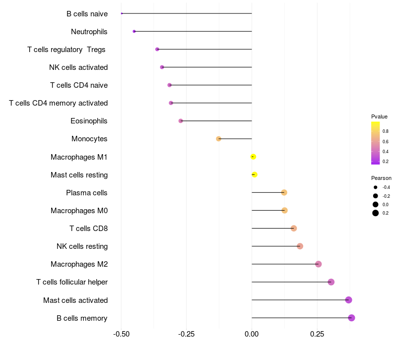 Lollipop of HIVEP3 expression and immune infiltrating cell level correlation result in HBV+ Liver cirrhosis samples