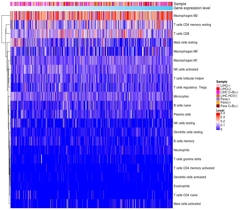 Liver hepatocellular carcinoma HCV (HBV+)(86), Liver hepatocellular carcinoma HCV (HBV-)(19), Liver hepatocellular carcinoma (HBV+)(209), Liver hepatocellular carcinoma (HBV+)(60), Paracancerous HCV (HBV+)(4), Paracancerous (HBV-)(28), Paracancerous (HBV+)(18) |