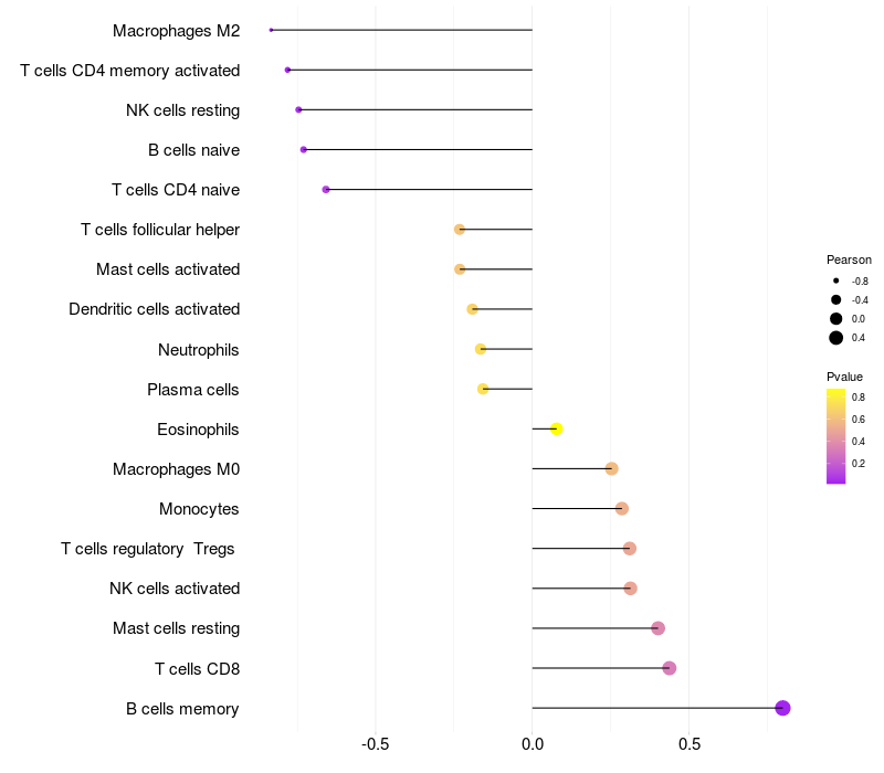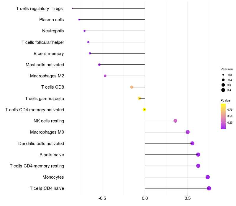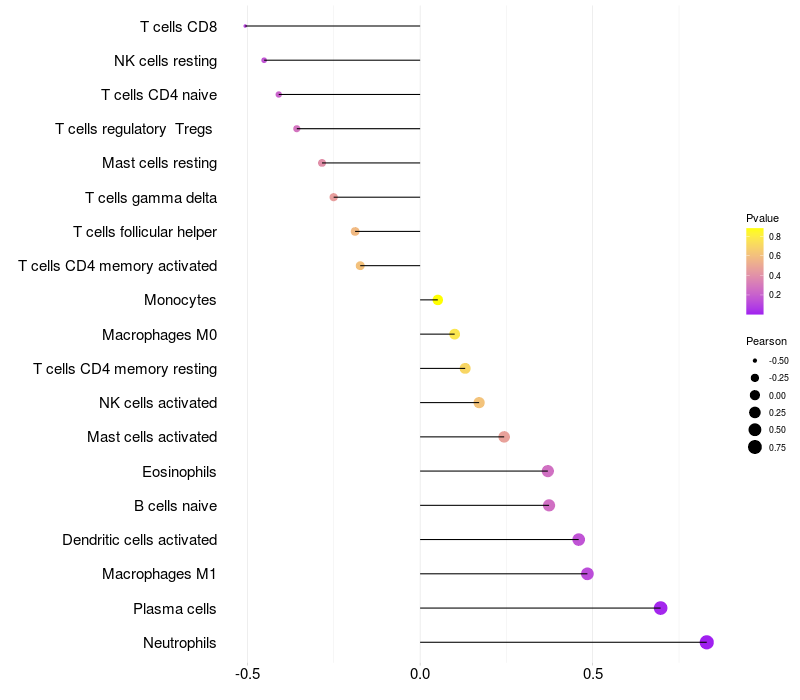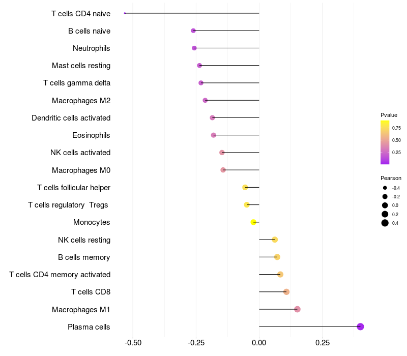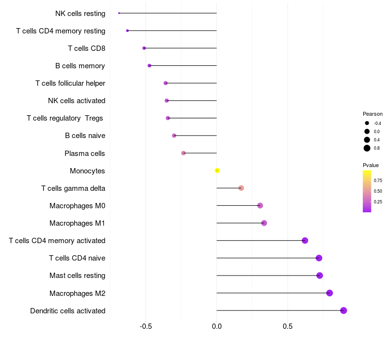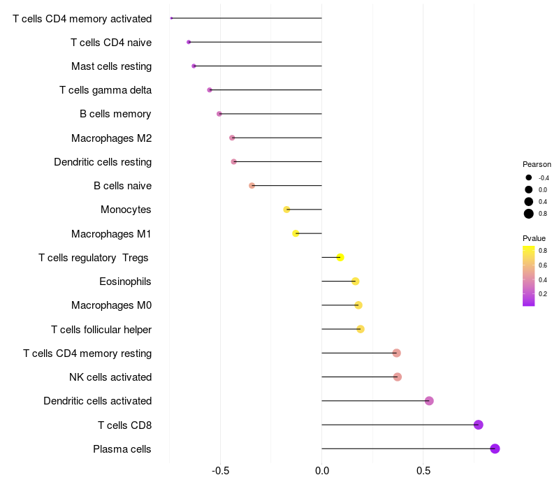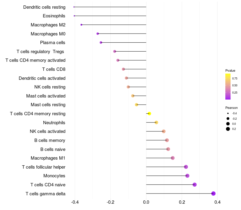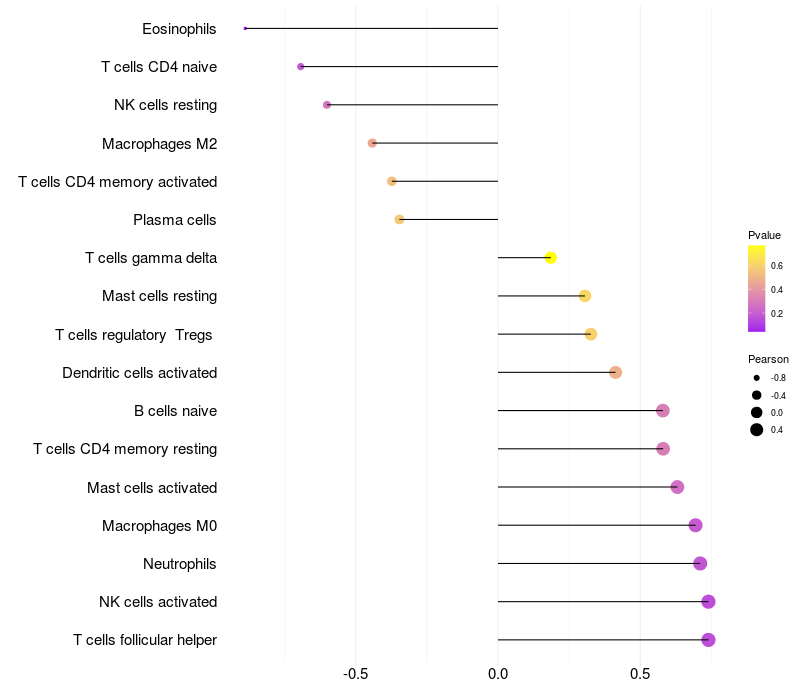 Lollipop of HLA-C expression and immune infiltrating cell level correlation result in EBV+ samples