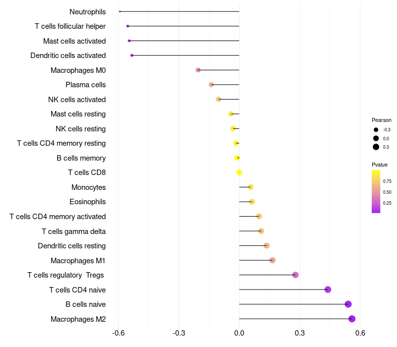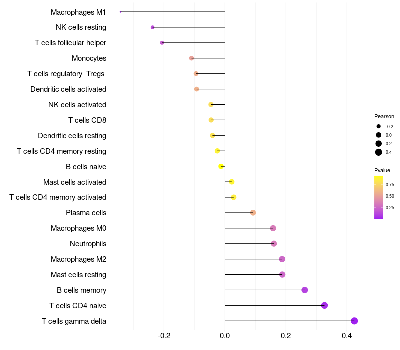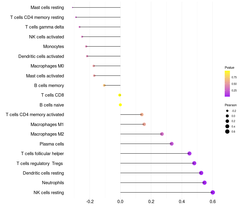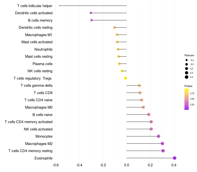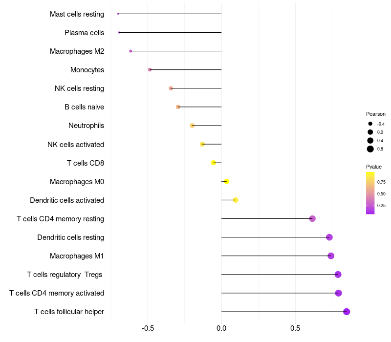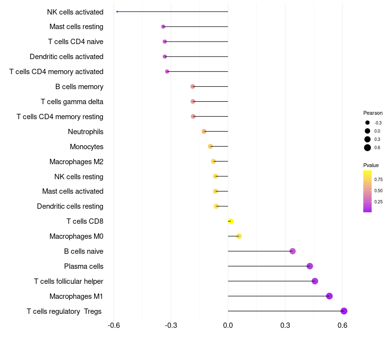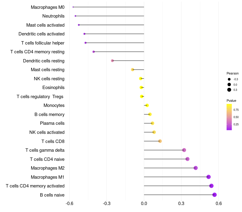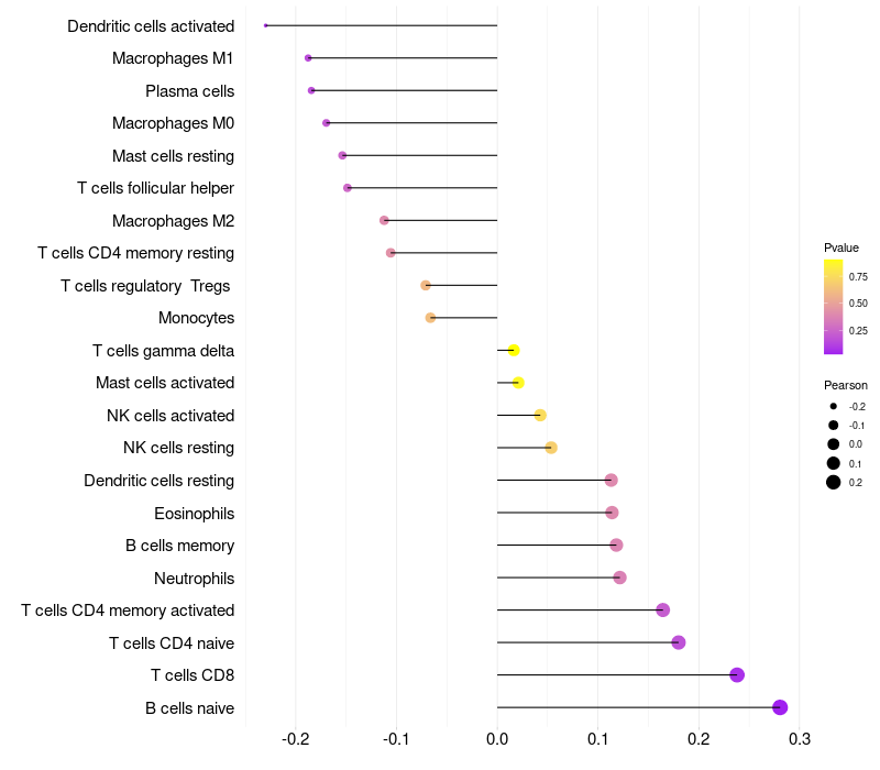 Lollipop of HMHB1 expression and immune infiltrating cell level correlation result in HPV+ samples