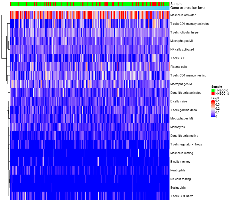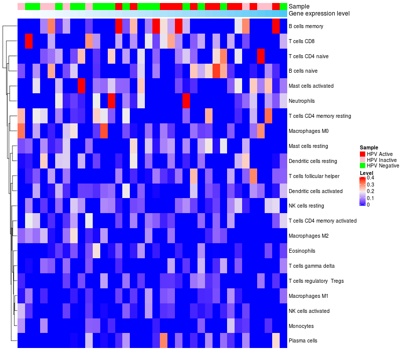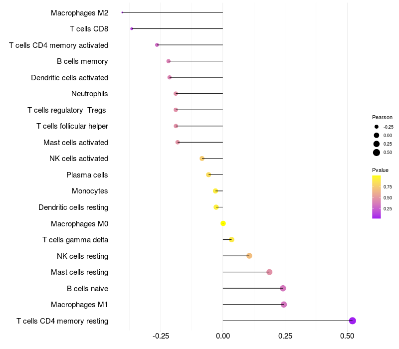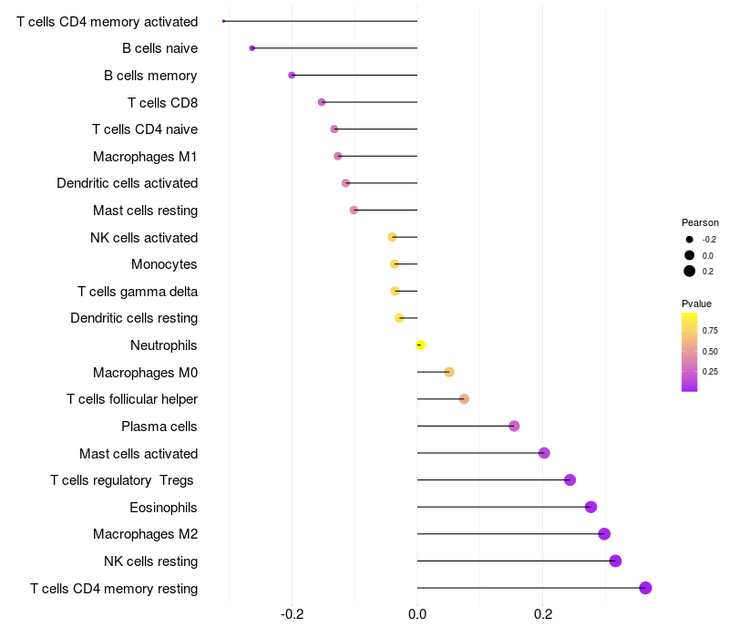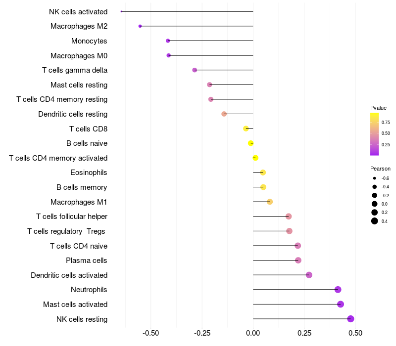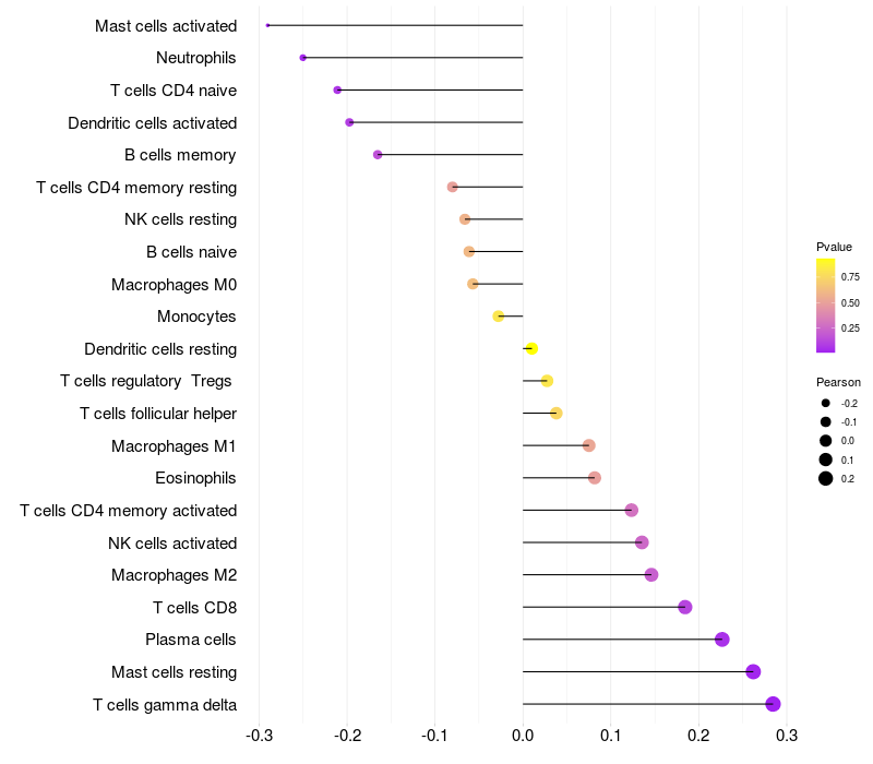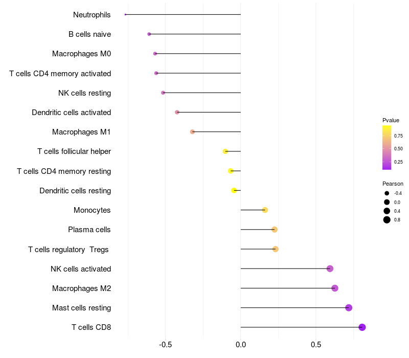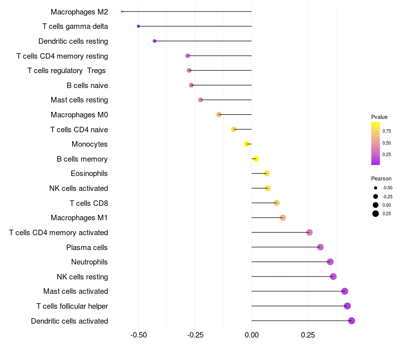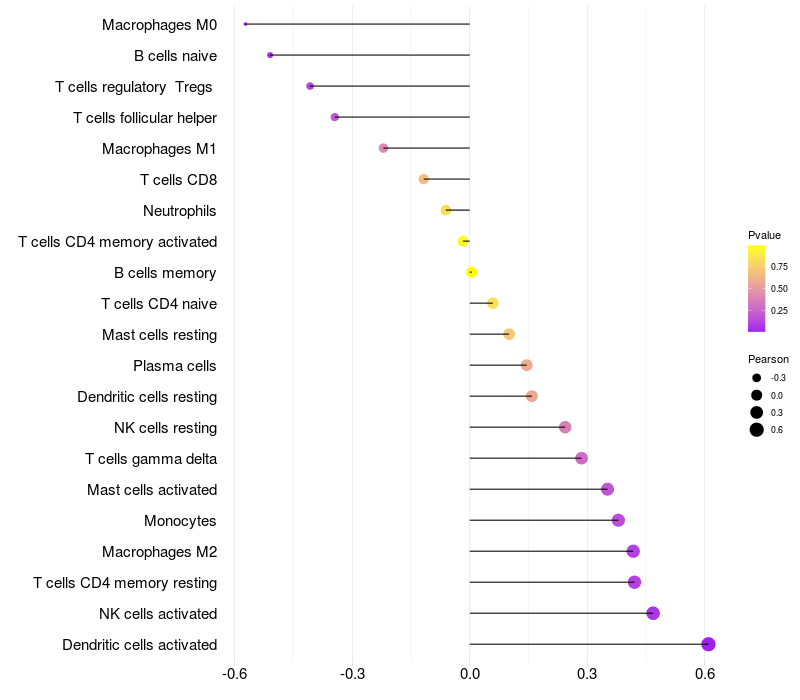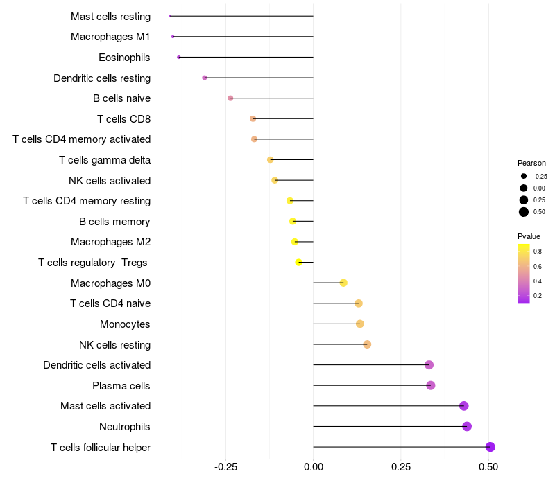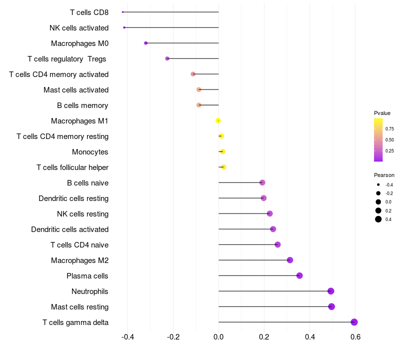 Lollipop of HOOK1 expression and immune infiltrating cell level correlation result in HPV+ samples