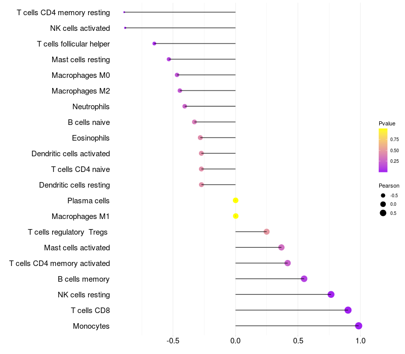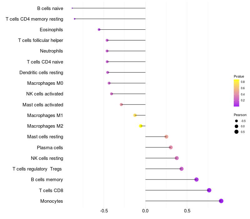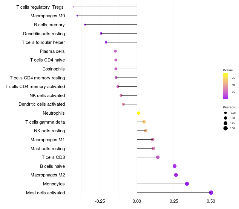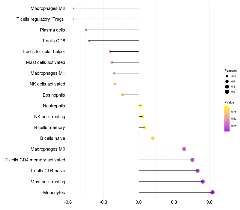 Lollipop of HP expression and immune infiltrating cell level correlation result in HBV+ Liver cirrhosis samples