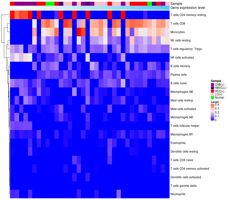 Lollipop of HPD expression and immune infiltrating cell level correlation result in HBV+ Chronic HBV (CHB) infection samples