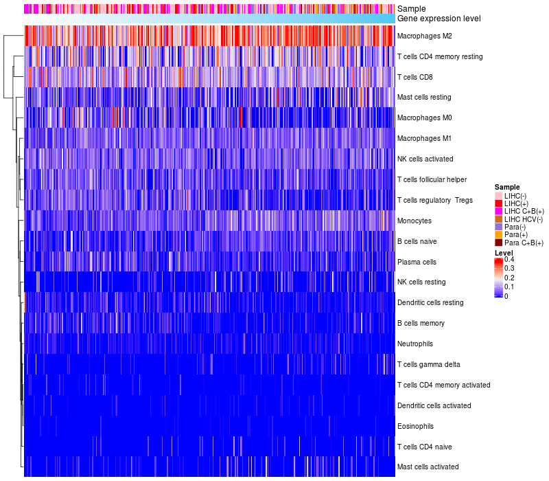 Liver hepatocellular carcinoma HCV (HBV+)(86), Liver hepatocellular carcinoma HCV (HBV-)(19), Liver hepatocellular carcinoma (HBV+)(209), Liver hepatocellular carcinoma (HBV+)(60), Paracancerous HCV (HBV+)(4), Paracancerous (HBV-)(28), Paracancerous (HBV+)(18) |