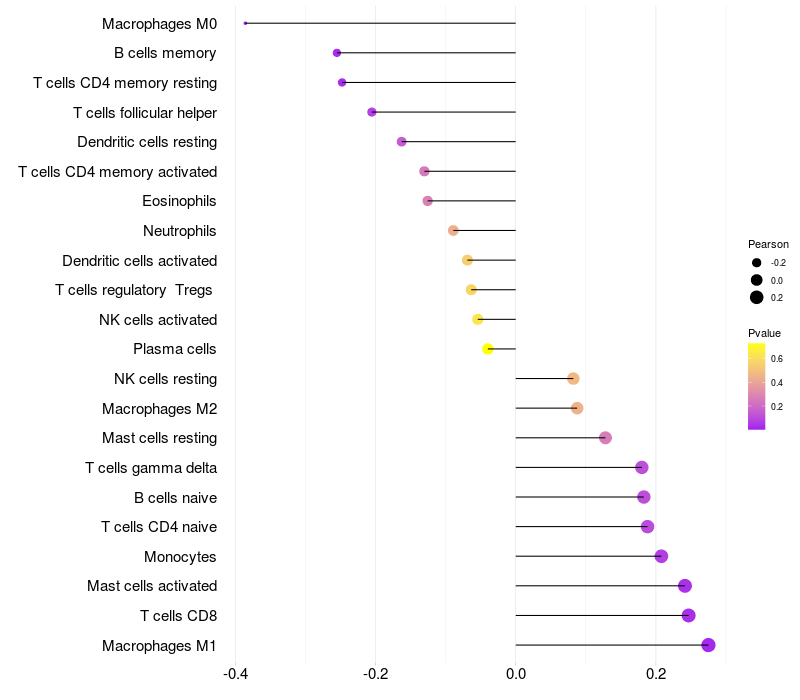 Lollipop of HPD expression and immune infiltrating cell level correlation result in HBV+ Liver cirrhosis samples