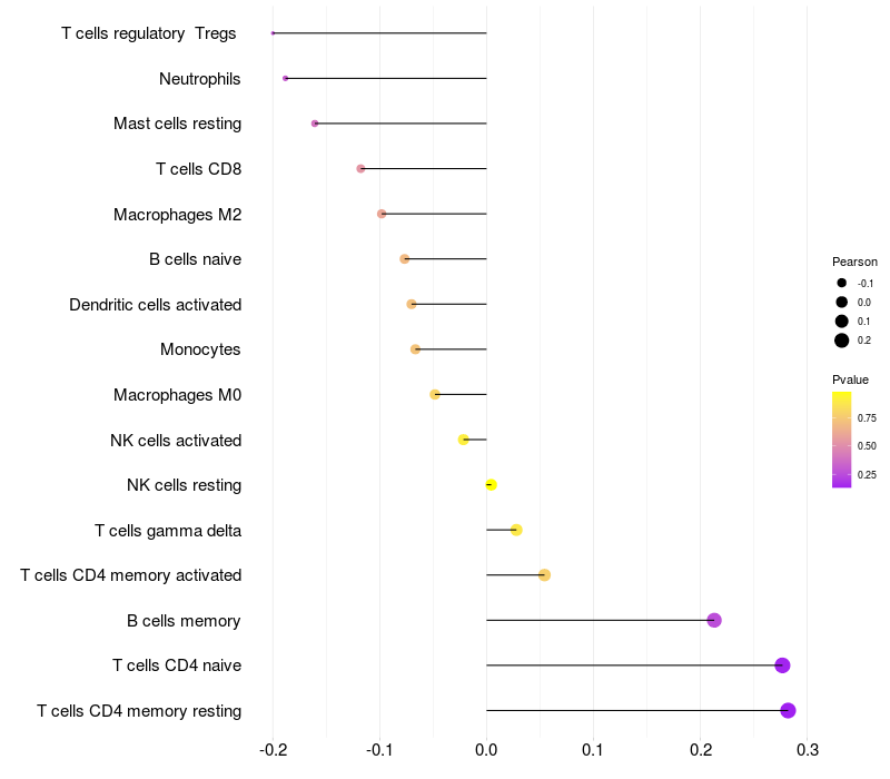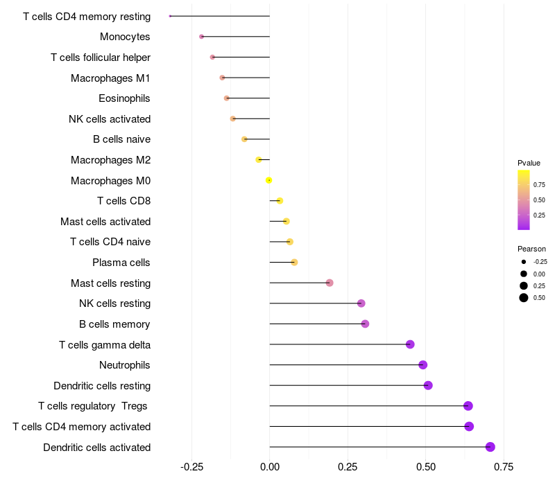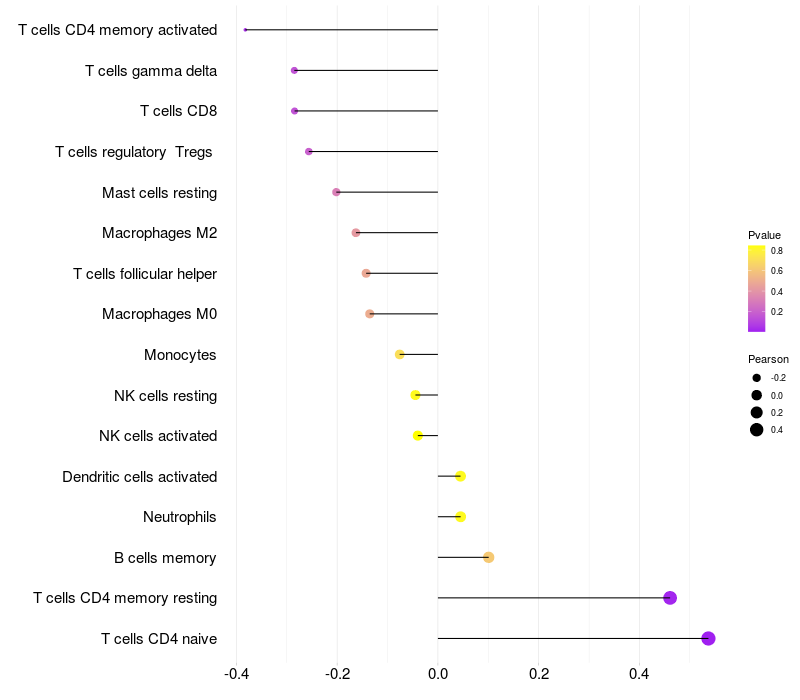 Lollipop of HPGD expression and immune infiltrating cell level correlation result in HTLV1+ samples