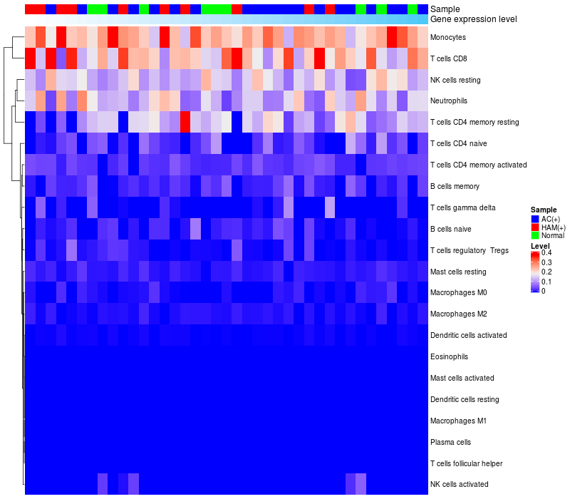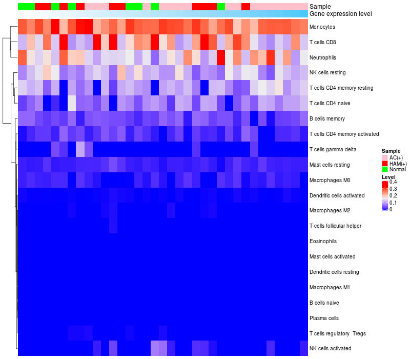 Normal (8), Asymptomatic carriers (HTLV1+)(17), HTLV-1-associated myelopathy (HTLV1+)(10) |