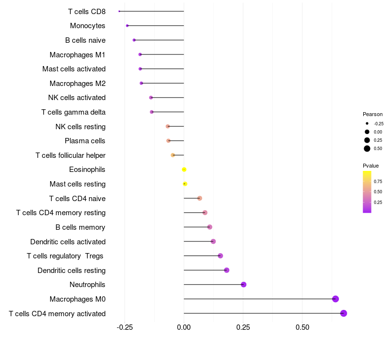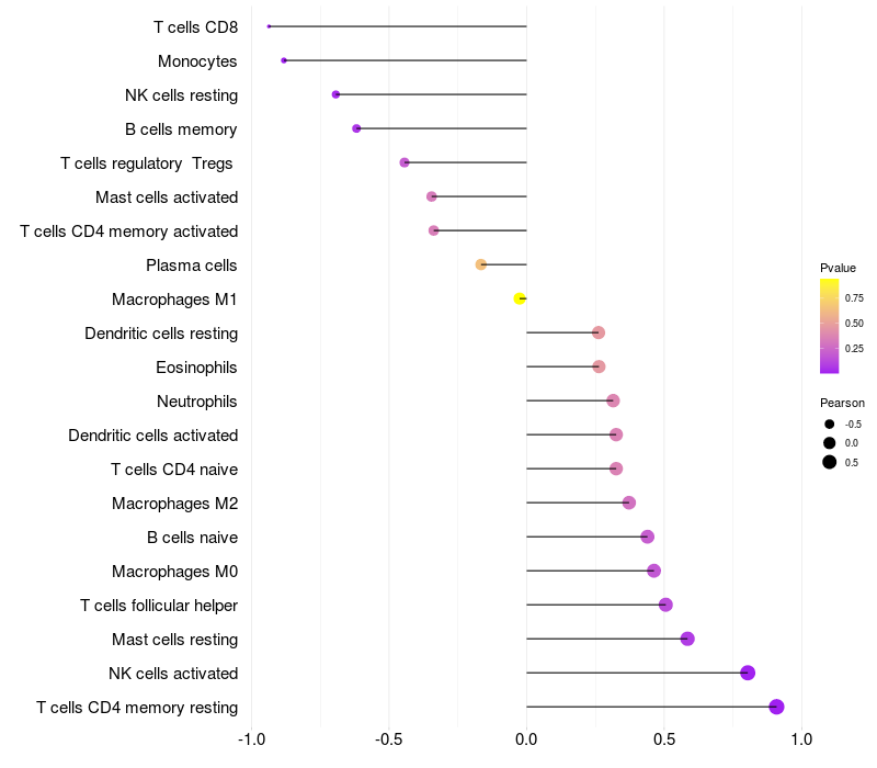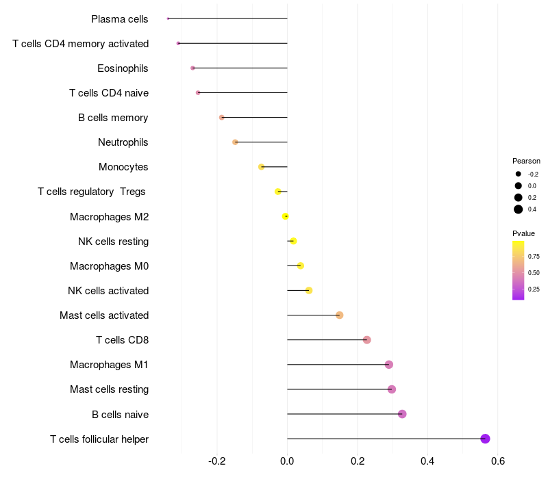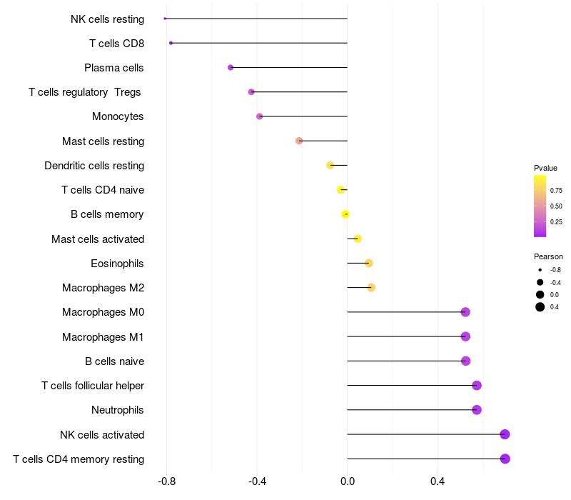 Lollipop of HPS4 expression and immune infiltrating cell level correlation result in HBV+ Liver cirrhosis samples