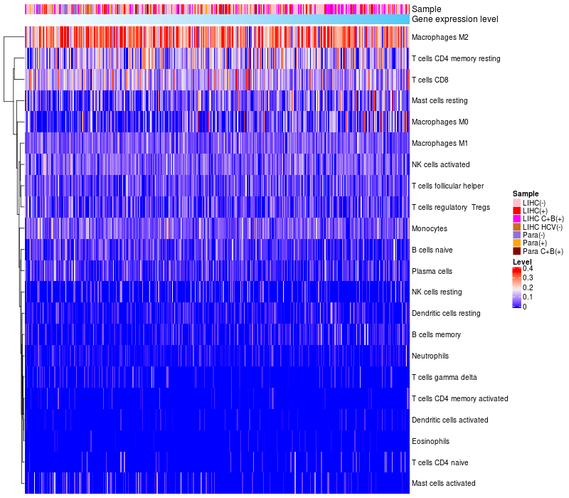Liver hepatocellular carcinoma HCV (HBV+)(86), Liver hepatocellular carcinoma HCV (HBV-)(19), Liver hepatocellular carcinoma (HBV+)(209), Liver hepatocellular carcinoma (HBV+)(60), Paracancerous HCV (HBV+)(4), Paracancerous (HBV-)(28), Paracancerous (HBV+)(18) |