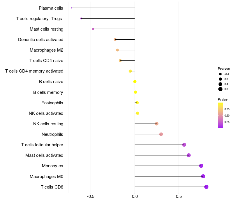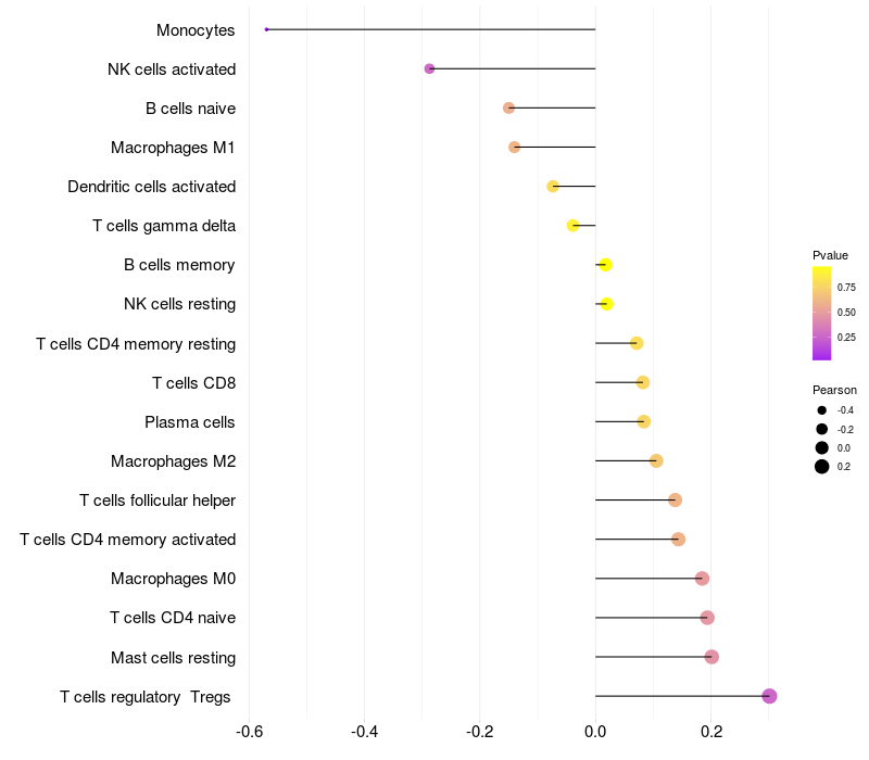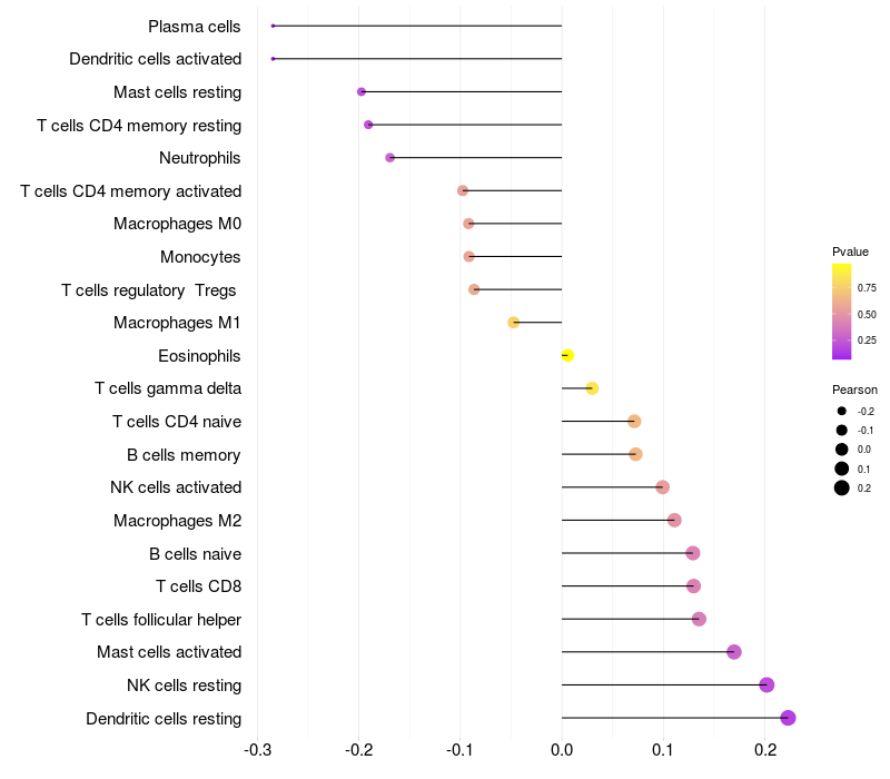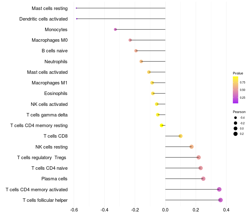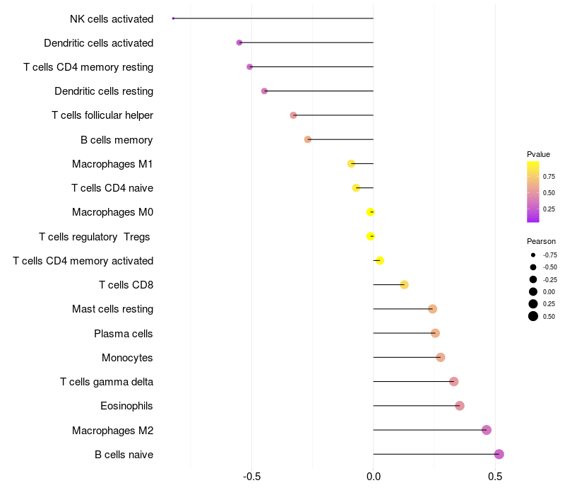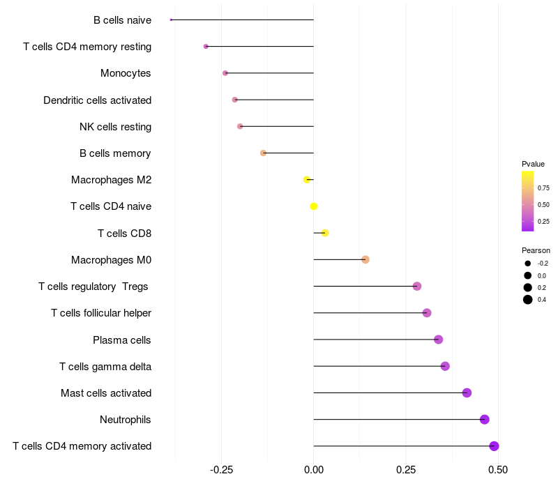 Lollipop of HPSE2 expression and immune infiltrating cell level correlation result in EBV+ samples