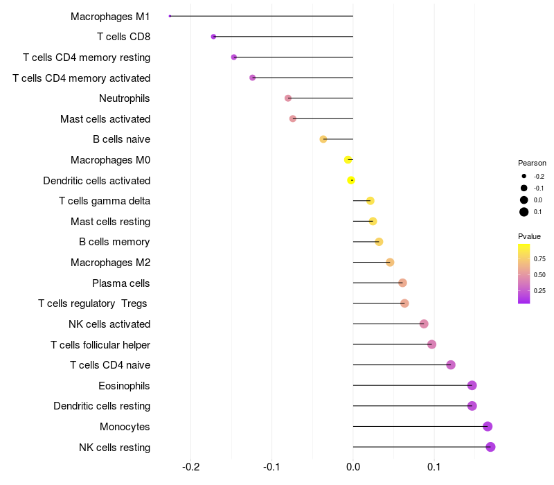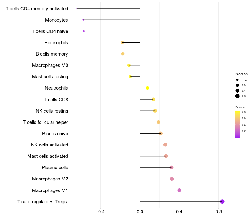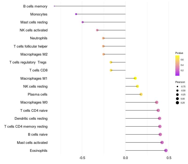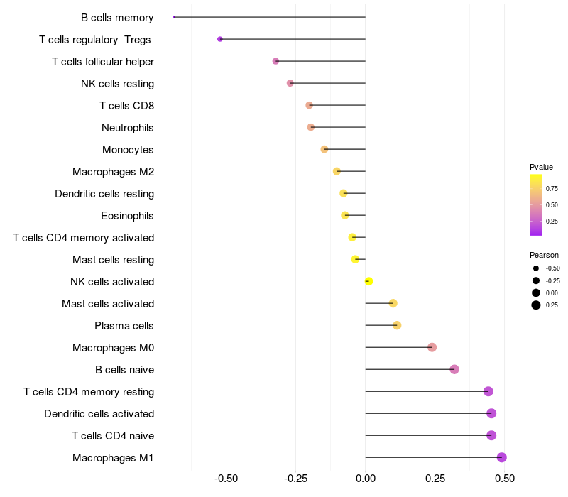 Lollipop of HS1BP3 expression and immune infiltrating cell level correlation result in HBV+ Chronic HBV (CHB) infection samples
