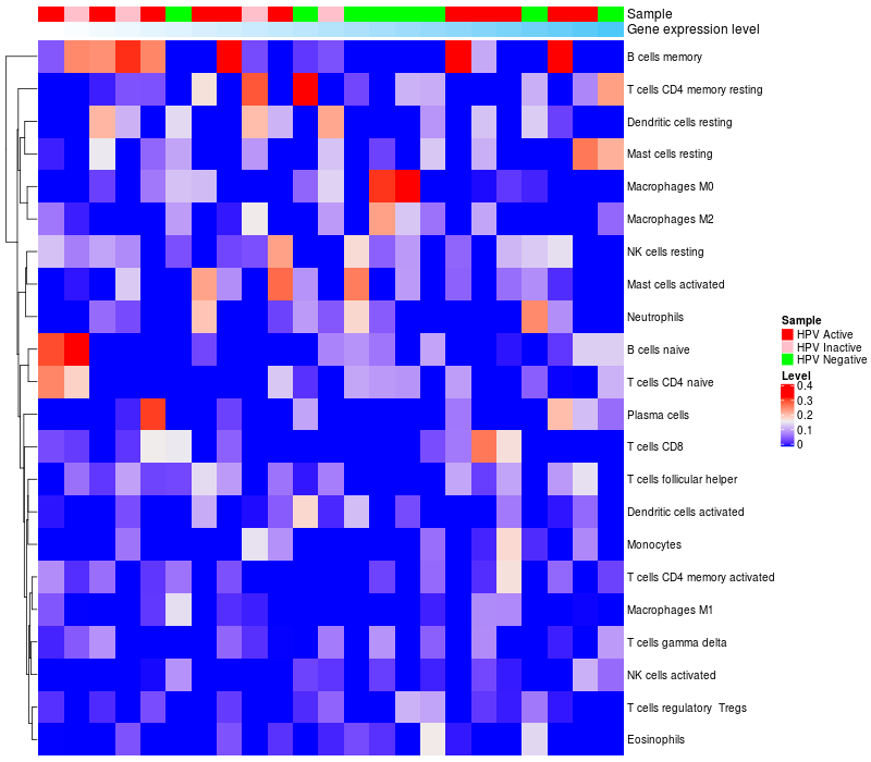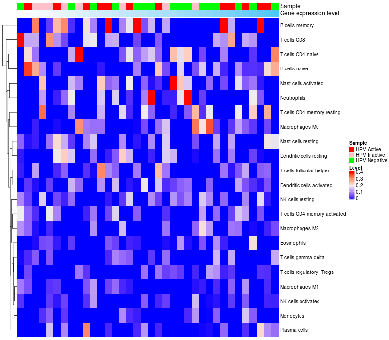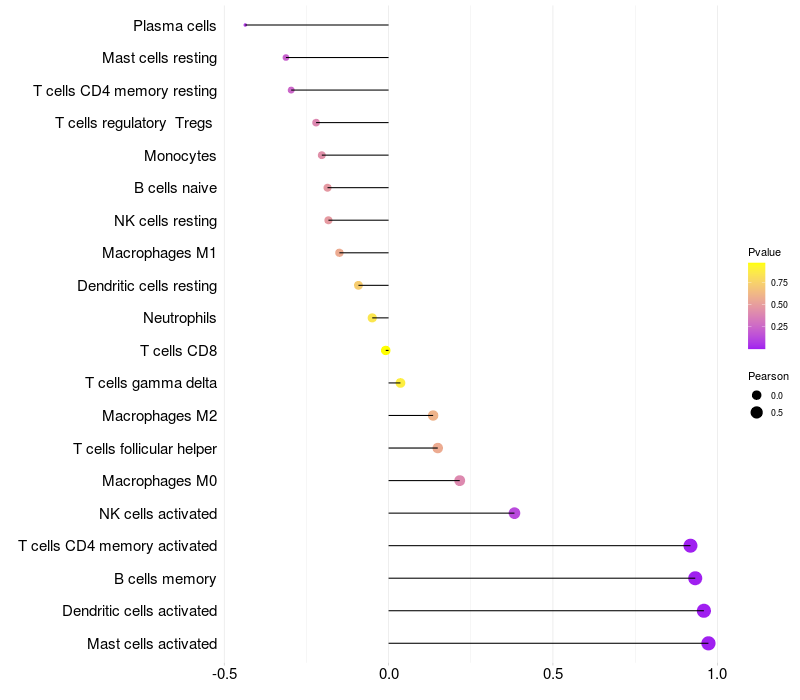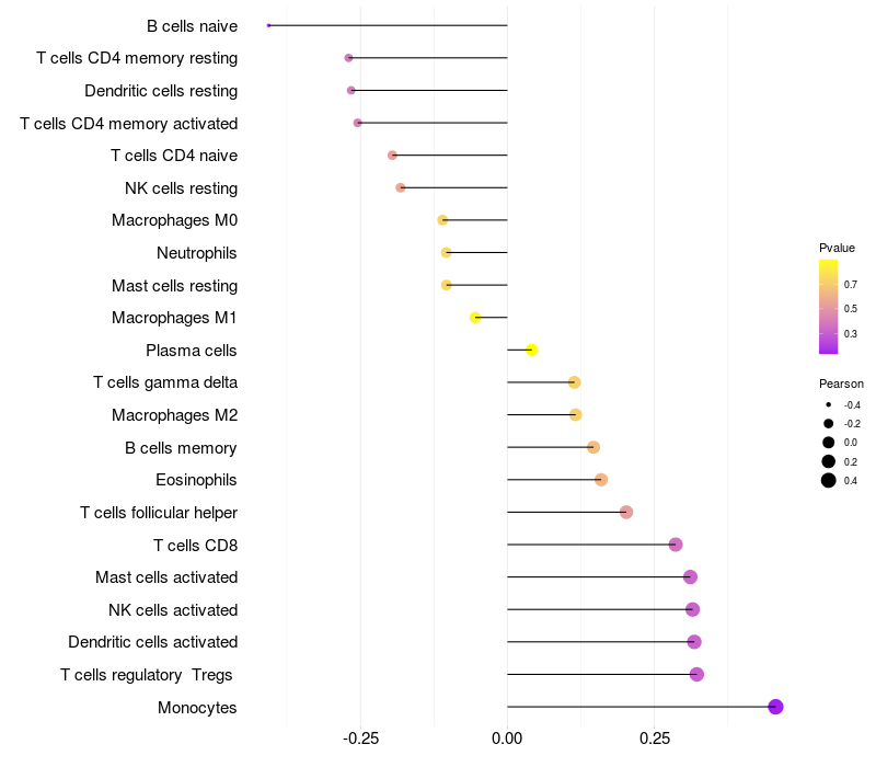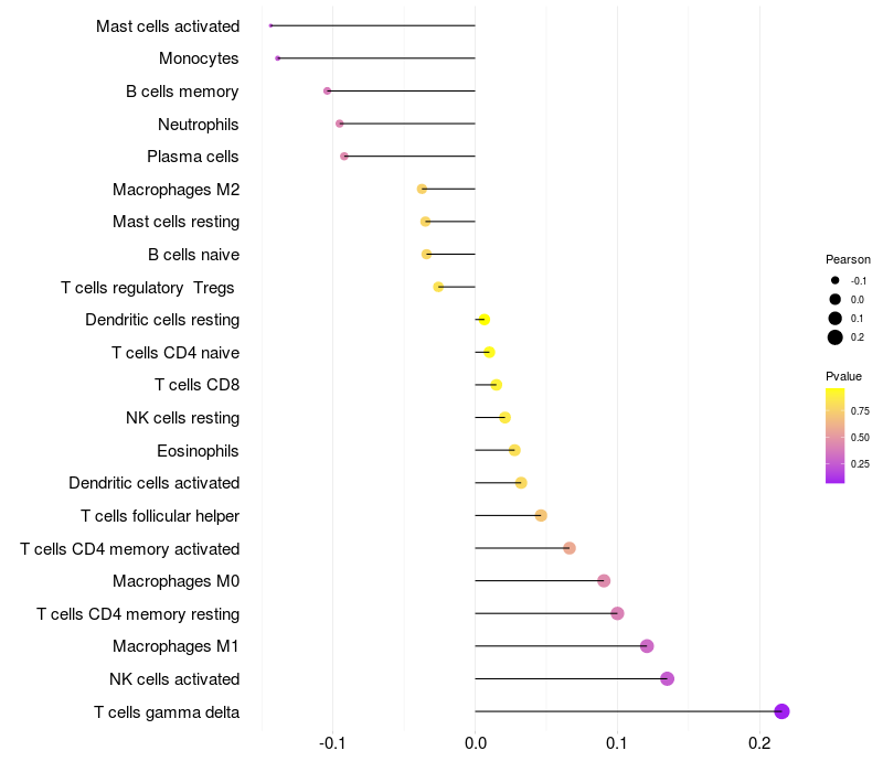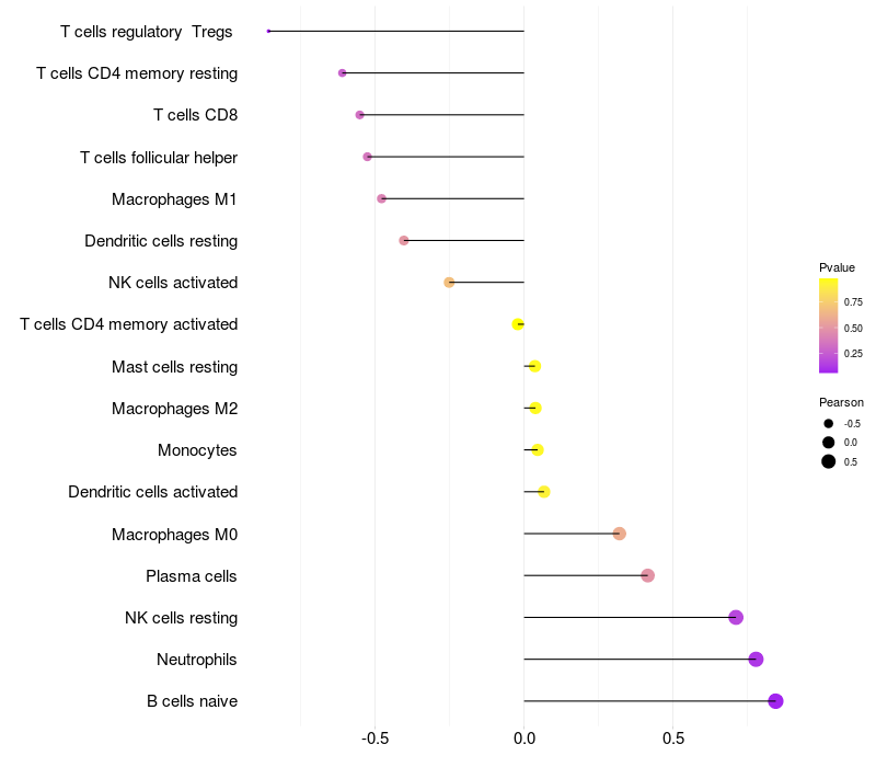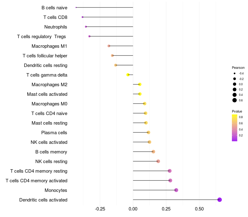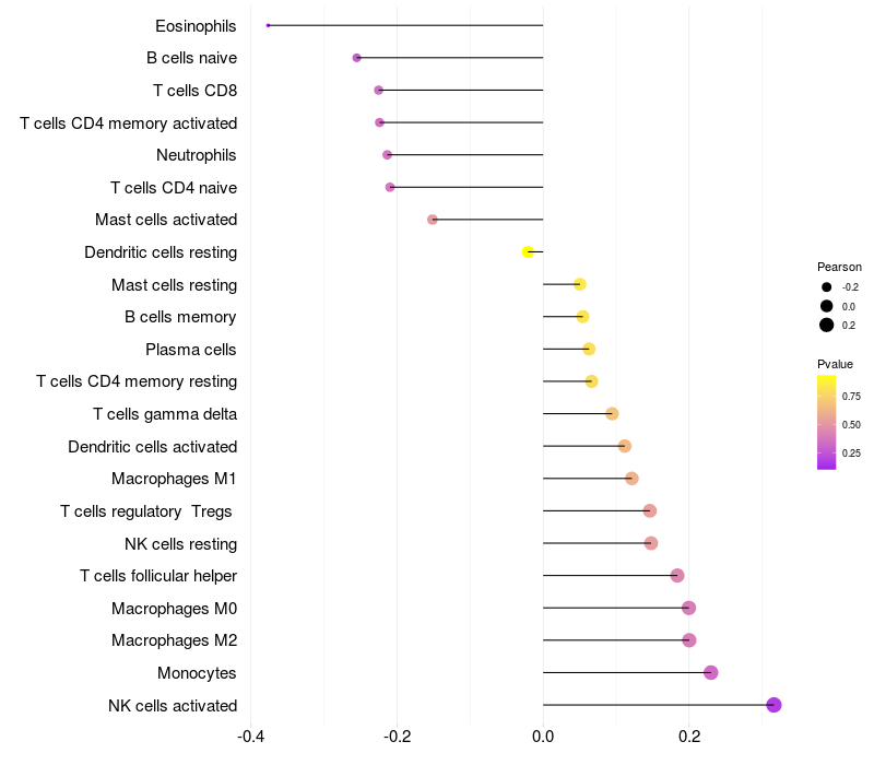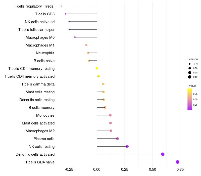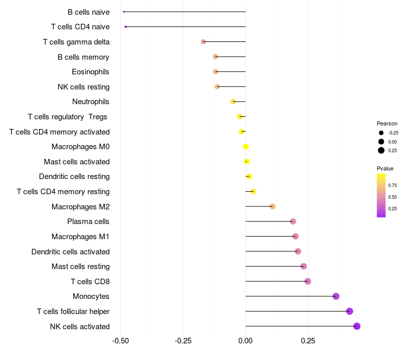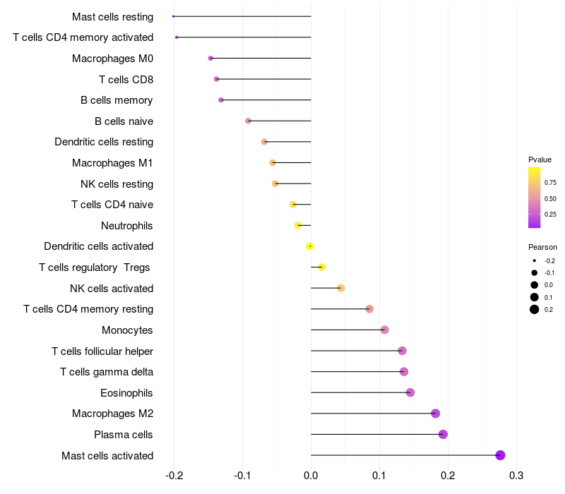 Lollipop of HS6ST2 expression and immune infiltrating cell level correlation result in HPV+ samples