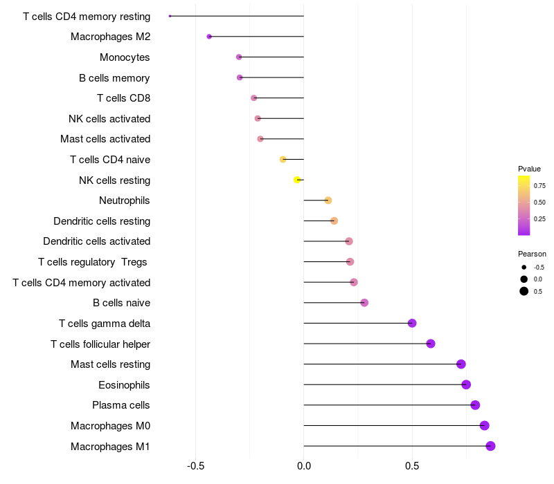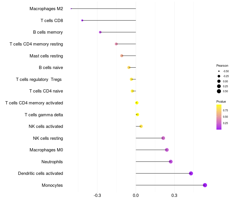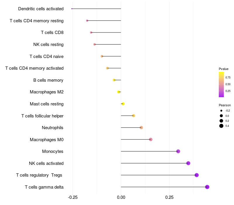 Lollipop of HSBP1 expression and immune infiltrating cell level correlation result in HTLV1+ samples