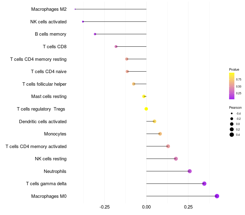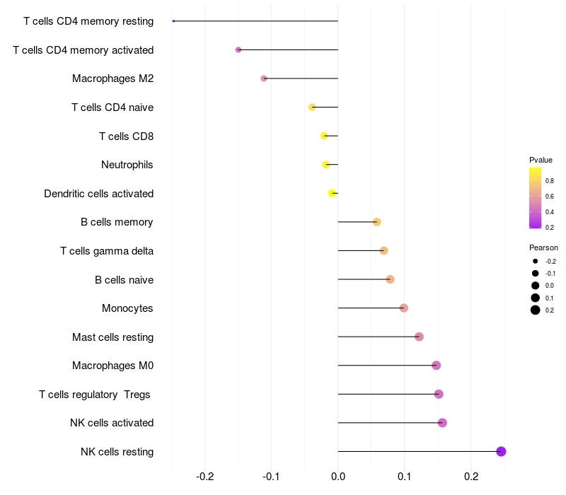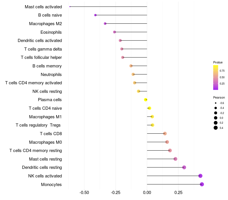 Lollipop of HSD3B2 expression and immune infiltrating cell level correlation result in HTLV1+ samples