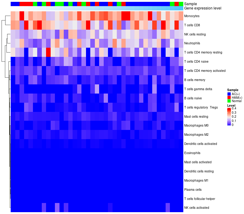 Normal (8), Asymptomatic carriers (HTLV1+)(17), HTLV-1-associated myelopathy (HTLV1+)(10) |