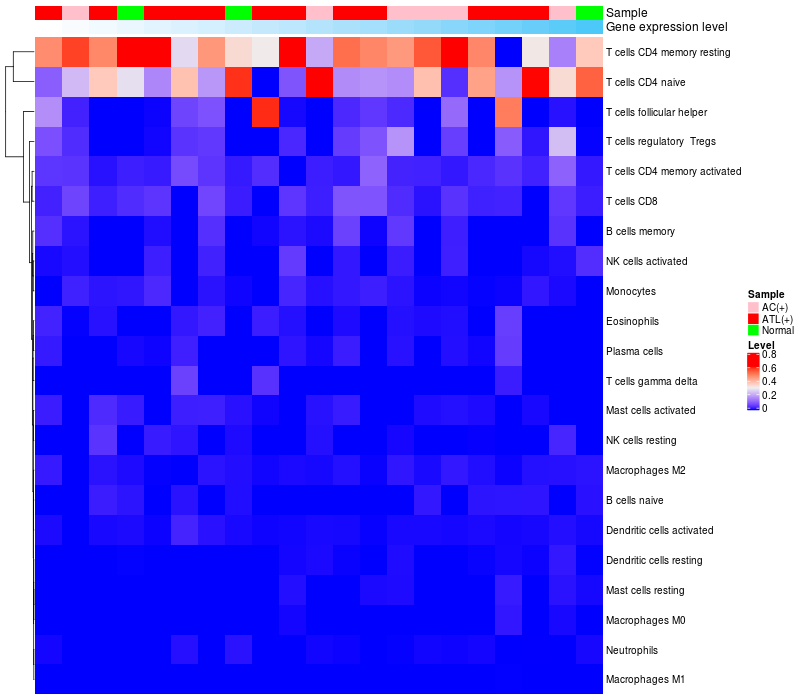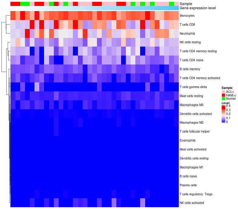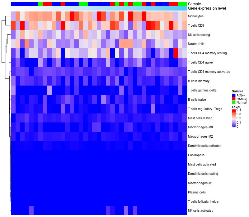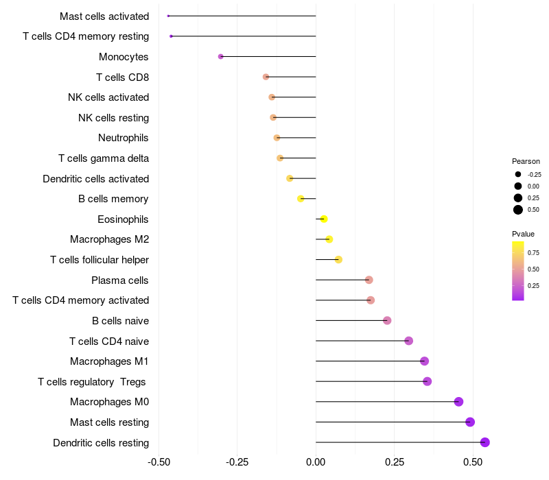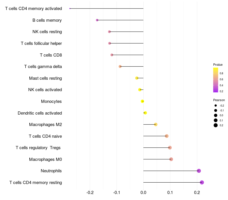 Lollipop of HSP90AB4P expression and immune infiltrating cell level correlation result in HTLV1+ samples