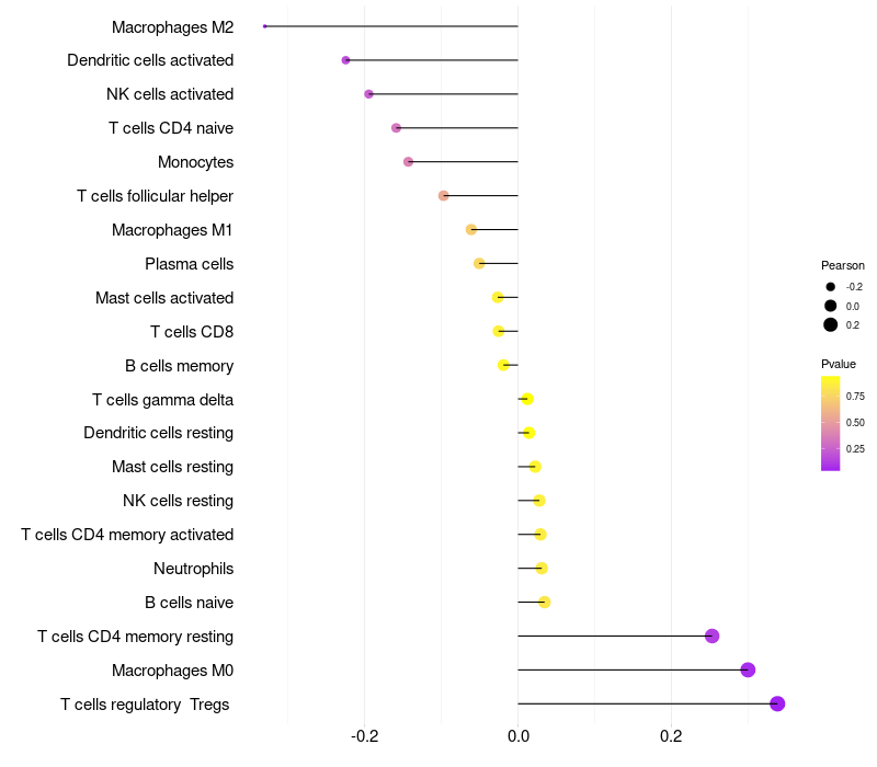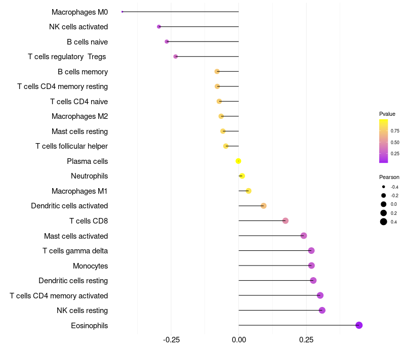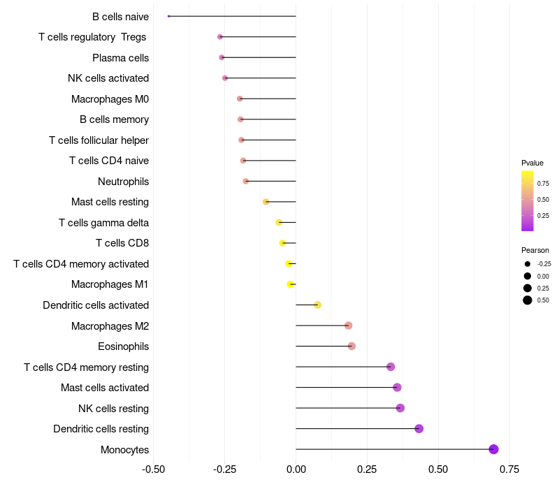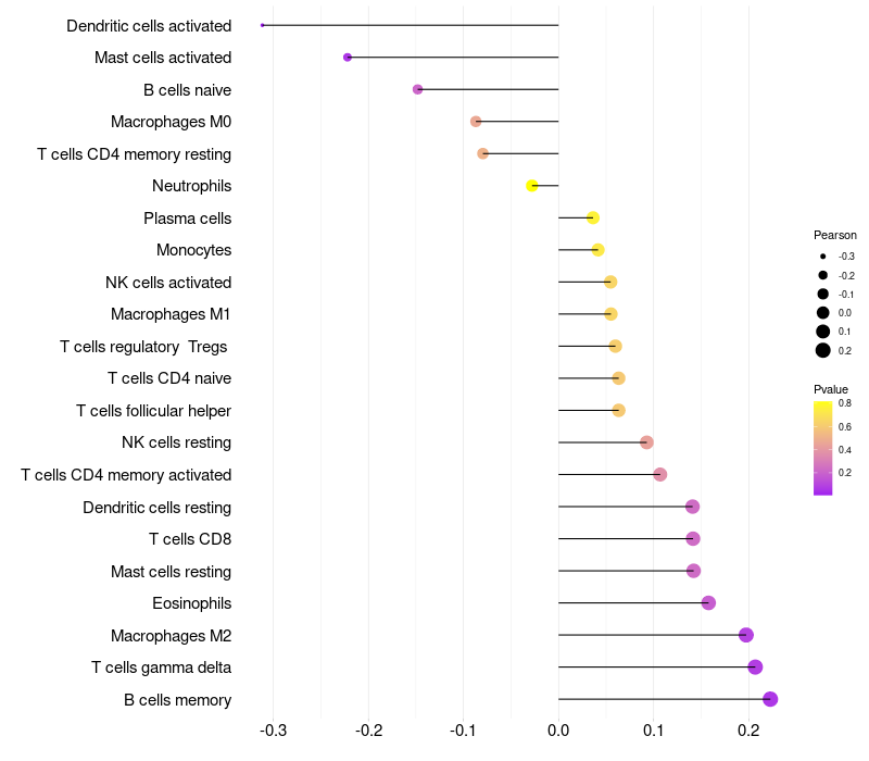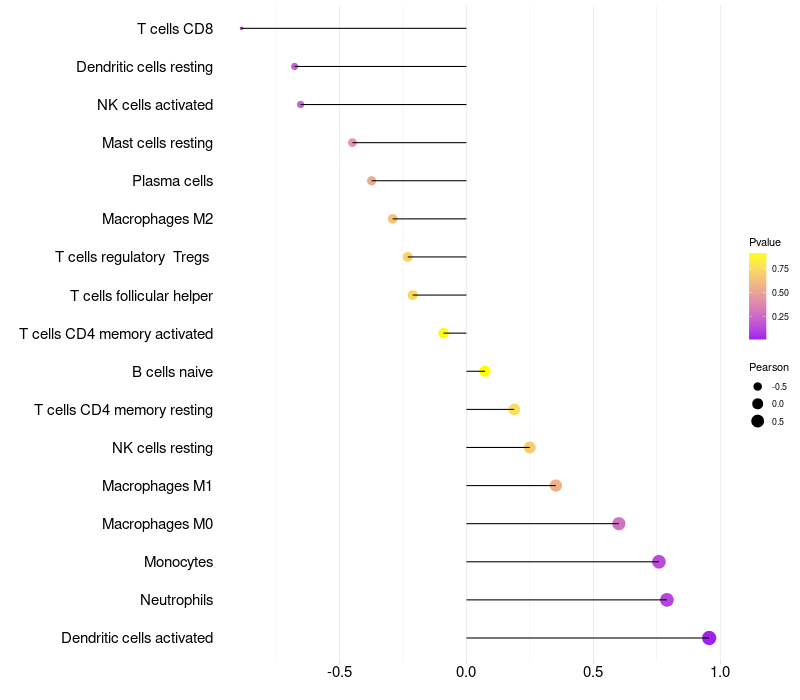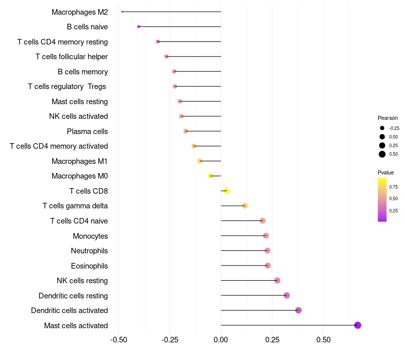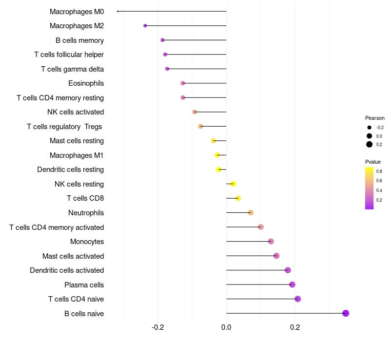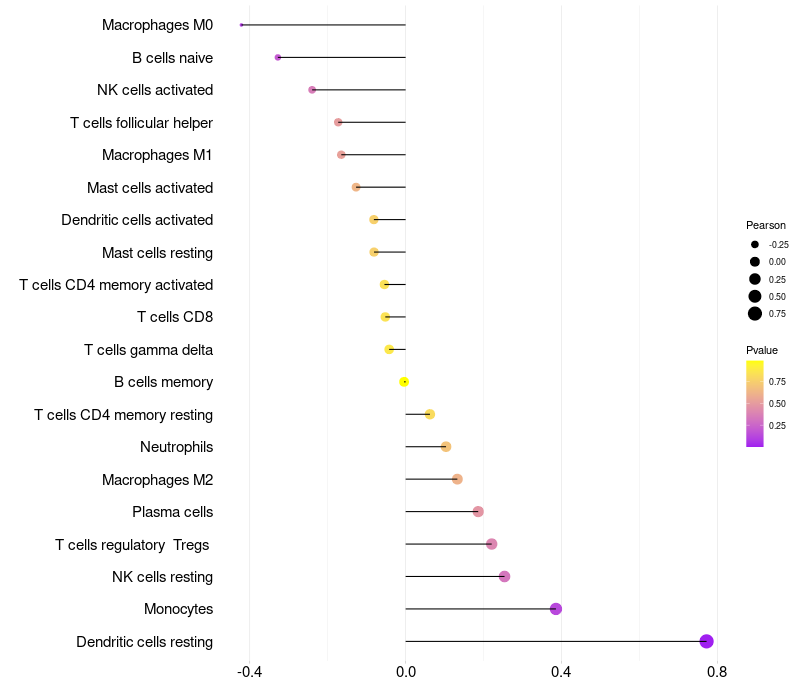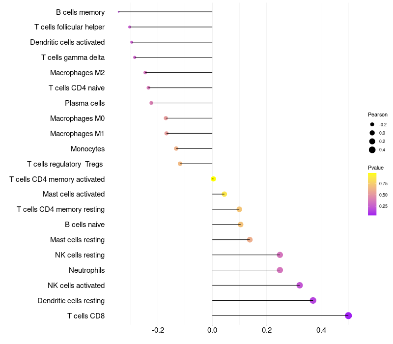 Lollipop of HSPB8 expression and immune infiltrating cell level correlation result in HPV+ samples