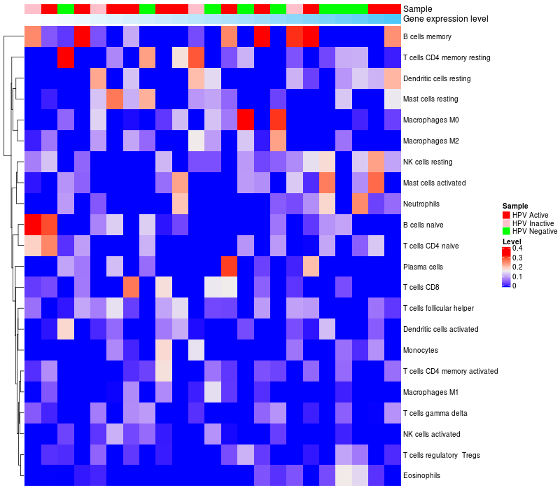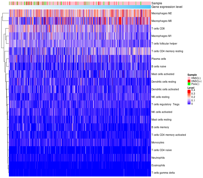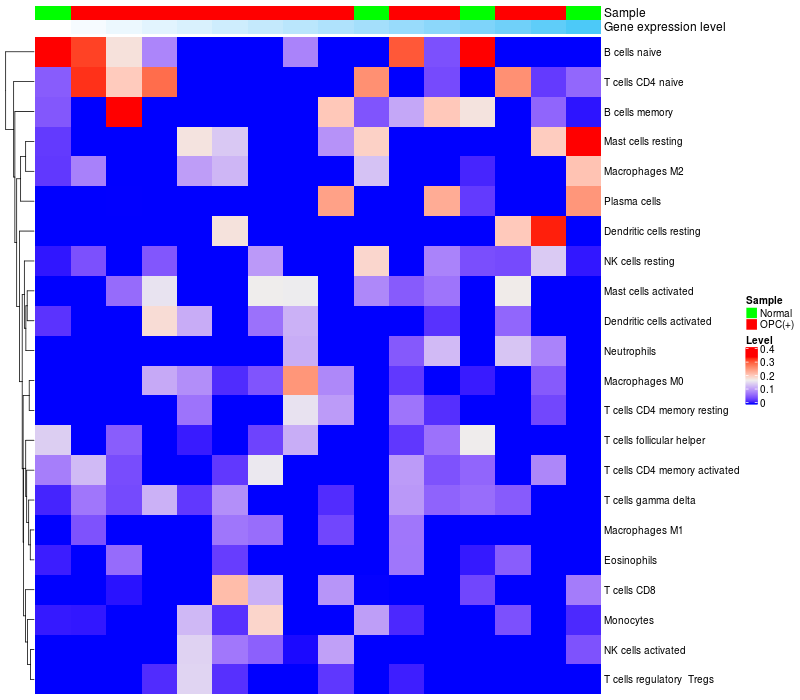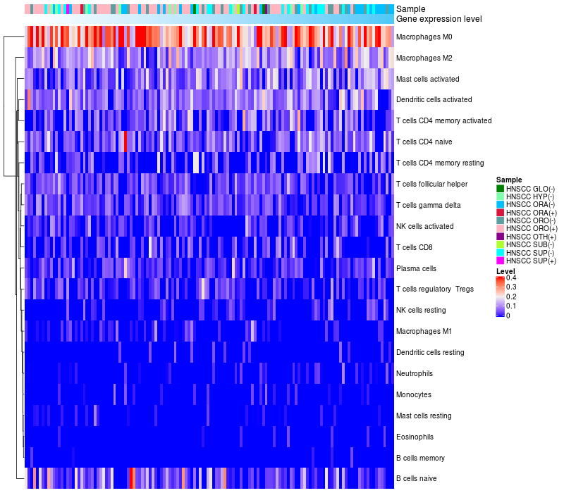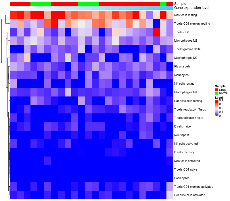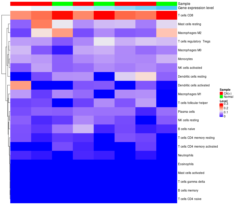 • Left: Heatmap of target gene expression and the level of various types of immune cells (cell type fractions) in all samples based on CIBERSORT method.